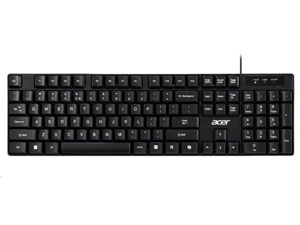 klávesnice Acer AKW100 voděodolná * klávesa Copilot * výška zdvihu kláves 4 mm * Retail Pack Technické parametry Rozvržení klávesnice: QWERTZ CZ/SK Délka kabelu: 1,8 m Technologie kláves: membránová Numerická klávesnice: ano Programovatelné klávesy: ne LED kontrolky: Num Lock, Caps Lock, Scroll Lock Rozhraní: USB-A 2.0 Barva: černá Rozměry: 432x124x27,5mm Hmotnost: cca 370g Doporučené požadavky na systém: volný port USB-ADodatočné parametre