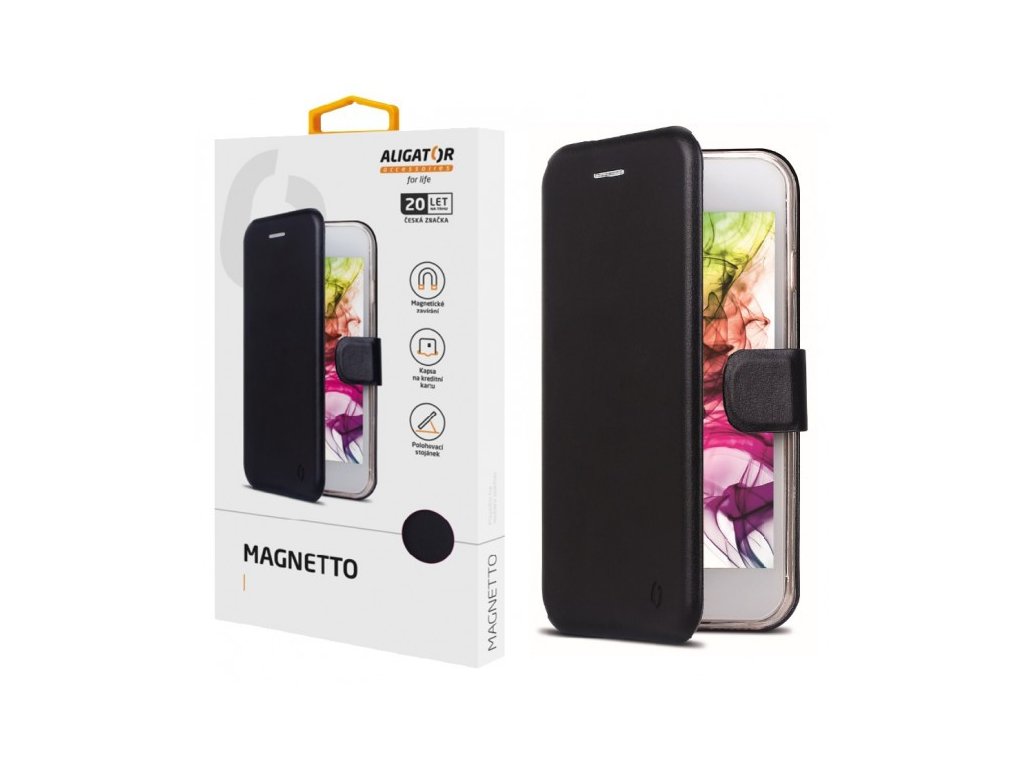 Nová řada dedikovaných pouzder značky ALIGATOR. Dokonale propracovaný design, ultratenké provedení, přihrádka na kartu nebo vizitky, zavírání pomocí magnetické přezky, snadné uchycení mobilního telefonu pomocí silikonové vaničky, stojánek… To je ALIGATOR MAGNETTO. Design je navržen tak, že oproti běžným zavíracím pouzdrům nezvětšuje mobilní telefon. Je pohodlným a reprezentativním doplňkem do kapsy i do kabelky. Přední odklápěcí strana je vybavena přezkou se skrytým magnetickým zavíráním. Tato přezka je navržena pro maximální ochranu Vašeho mobilního telefonu. Polstrovaná podšívka, příjemná na omak, přispívá k ochraně displeje Vašeho mobilního telefonu, stejně jako důmyslně zpracovaná silikonová vanička, která zároveň skvěle fixuje daný model telefonu. Na vnitřní levé straně pouzdra najdete důmyslně skrytou přihrádku na kreditní kartu, nebo vizitky. Pouzdro je vyrobené z velmi kvalitní a odolné PU kůže ve dvou barevných provedeních. Jednou z klíčových vlastností pouzdra je velmi tenké a jemné zpracování boku pro pohodlí při manipulaci. Součástí pouzdra je i praktický stojánek, díky němuž můžete pohodlně a bez držení v ruce, sledovat videa nebo prohlížet fotografie. Pouzdro MAGNETTO je stvořené pro Váš mobilní telefon, je stylovým doplňkem a zároveň skvělou ochrannou. • Dedikované pouzdro • Zavírání pomocí magnetické přezky • Přihrádka na kartu nebo vizitky • Funkce rychlého stojánku • Ultratenké provedení • Kvalitní zpracování • Elegantní design • Snadné uchycení mobilního telefonu pomocí silikonové vaničky • Barevné provedení: černá* Obrázek je pouze ilustrační a zobrazuje stejné pouzdro pro jiný model telefonu. Výřezy na fotoaparát a konektory jsou dle daného telefonu.