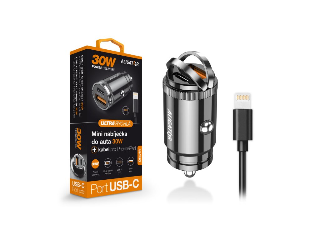 Aligator mini nabíjačka do auta Power Delivery 30W, USB-C + USB-A, USB-C kábel pre iPhone / iPad