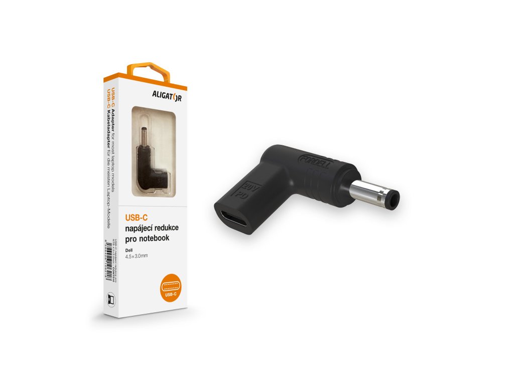 USB-C napájecí redukce 4,5 x 3,0 mm pro notebooky Dell USB-C napájecí redukce 4,5 x 3,0 mm pro notebooky Dell řady ALIGATOR POWER. Tato redukce je ideálním řeším pro dobíjení Vašeho notebooku nebo ultrabooku. Redukce disponuje USB-C vstupem pro připojení USB-C nabíječky. Nabíječku vždy vybírejte podle výkonnostních požadavků nabíjeného zařízení. USB-C napájecí redukce 4,5 x 3,0 mm Určení: *Notebooky *Ultrabooky Kompatibilita s notebooky a ultrabooky: *Dell Vstup: USB-C / PD 20V DC Výstup: viz. redukce Barva: černáDodatočné parametre