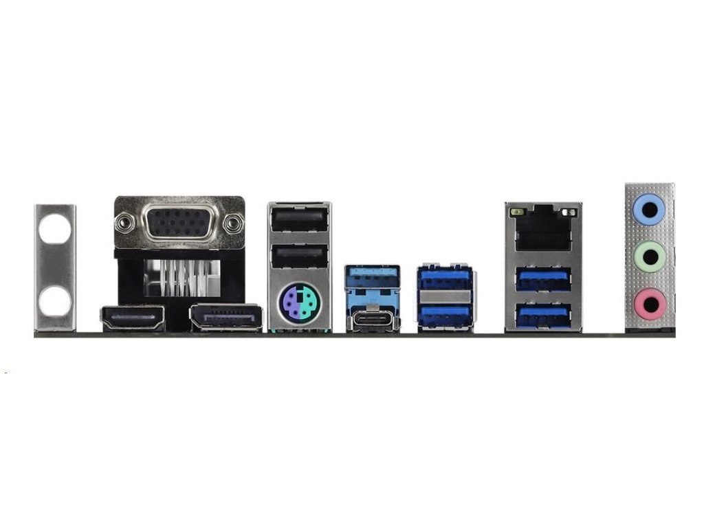 | Vstupy/výstupy na zadnom paneli | - Držiak antény - 1 x port PS/2 pre myš/klávesnicu - 1 x port D-Sub - 1 x port HDMI - 1 x DisplayPort 1.4 - 1 x USB 3.2 Gen1 port typu A (podporuje ochranu proti ESD) - 4 x USB 3.2 porty typu A Gen1 (rozbočovač ASMedia ASM1074) (podporuje ochranu proti prepätiu) - 1 x USB 3.2 Porty typu C Gen1 (podporuje ochranu proti prepätiu) - 2 x USB 2.0 portov (podporuje ochranu proti ESD) - 1 x RJ-45 LAN port s LED diódou (ACT/LINK LED a SPEED LED) - HD audio konektory: Line in / Front Speaker / Microphone |