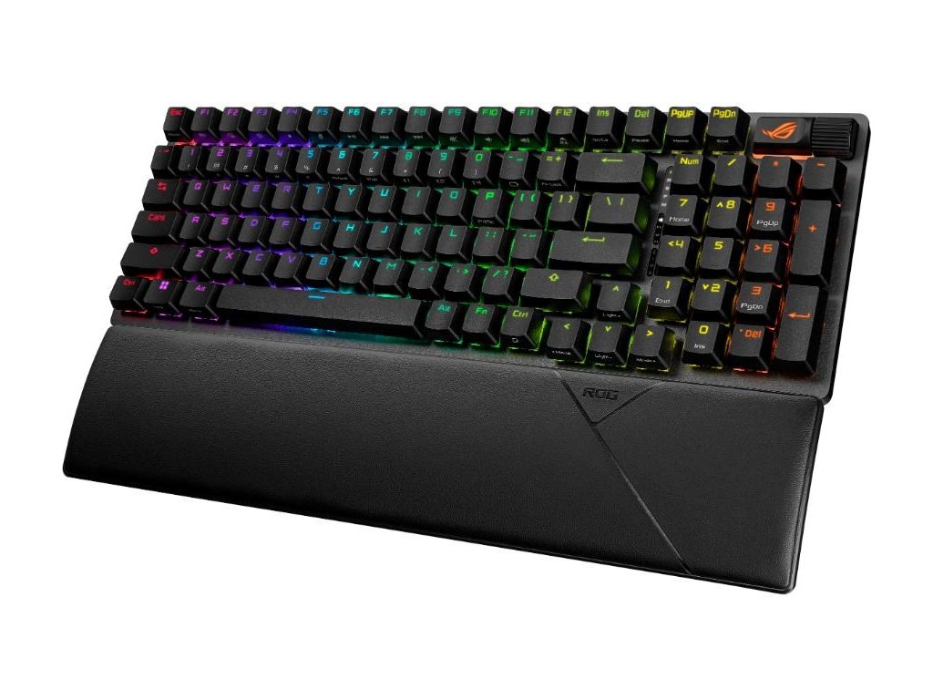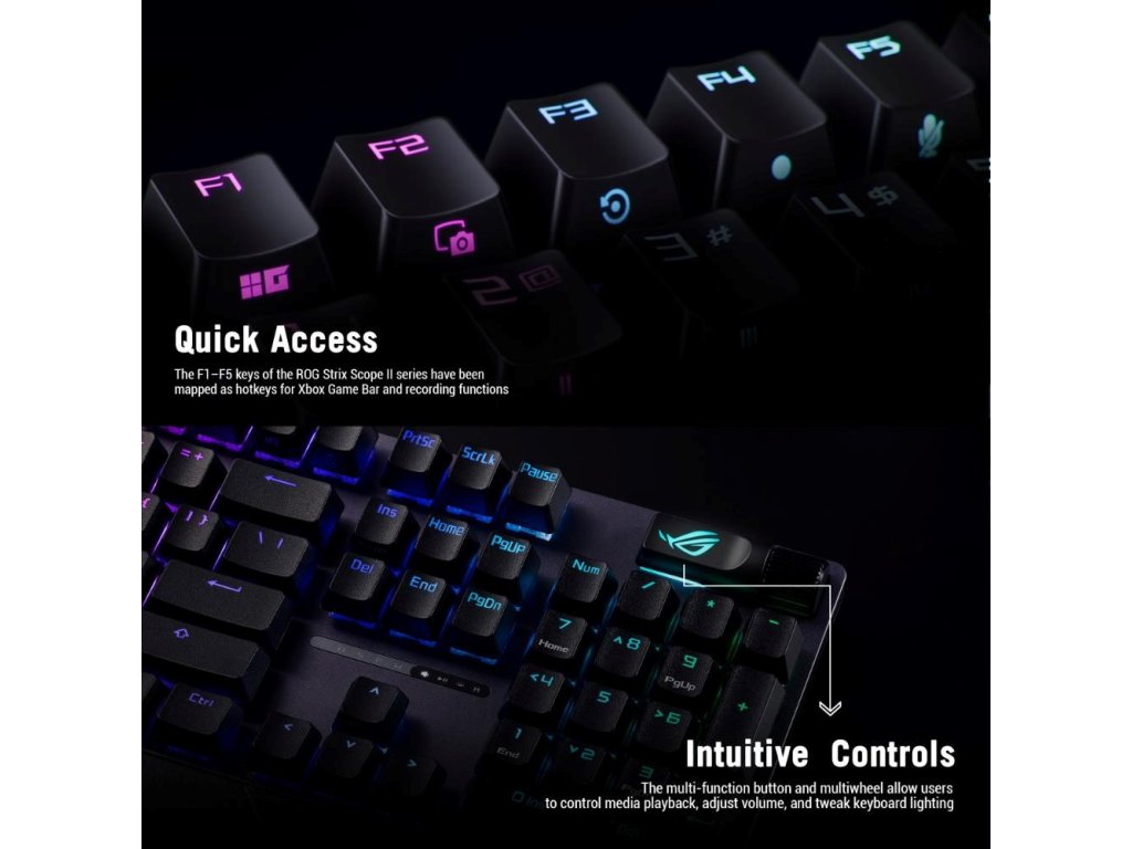 Herná klávesnica ROG Strix Scope II X s mechanickými spínačmi ROG NX V2 s možnosťou výmeny počas prevádzky, penovým tlmením hluku, zdvojenými klávesami PBT alebo ABS s UV povlakom, streamovacími klávesmi, multifunkčnými ovládacími prvkami, tromi regiónmi sklonu a opierkou zápästia.