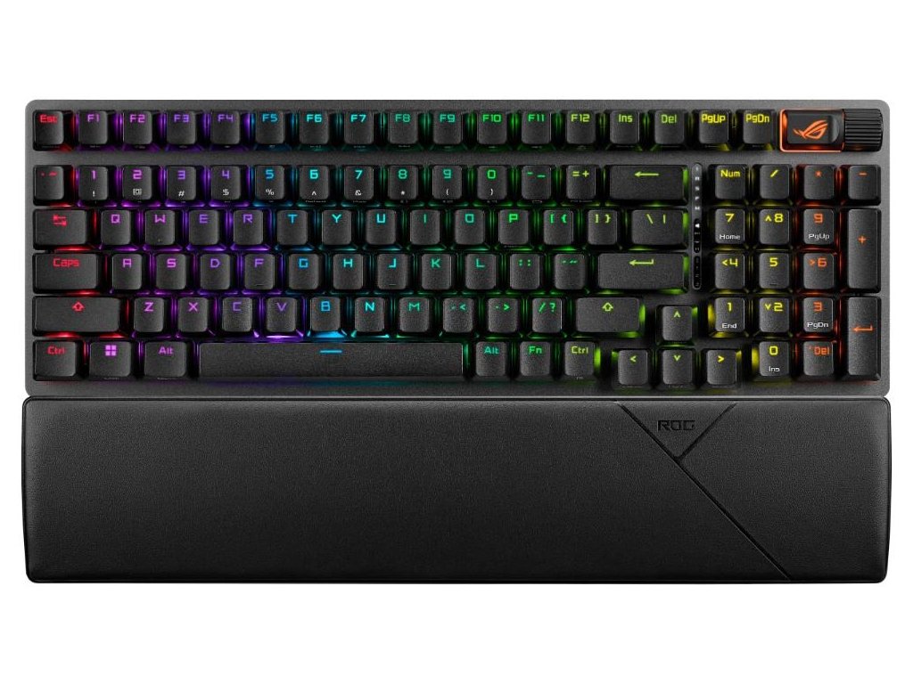 Herná klávesnica ROG Strix Scope II X s mechanickými spínačmi ROG NX V2 s možnosťou výmeny za prevádzky, penovým tlmením zvuku, zdvojenými klávesami PBT alebo ABS s UV povlakom, streamovacími klávesami, multifunkčnými ovládacími prvkami, tromi uhlami sklonu a opierkou zápästia.