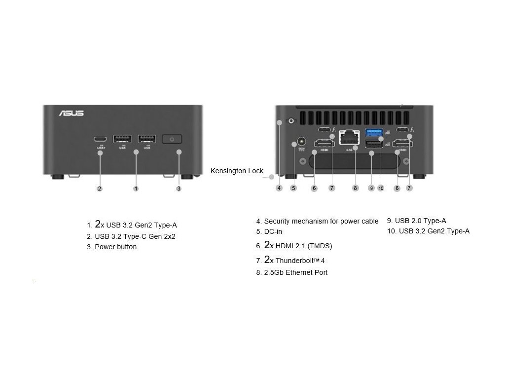 ASUS NUC 15 PRO Kit, 185CNUC15PROU7H - 90AR00Q2-M000A0 Popis produktu: ASUS NUC 15 PRO RNUC15CRHU700002/Cyber Canyon - EU power cord Typ procesoru: Intel® Core™ Ultra 7 255H Typ paměti: podporuje DDR5 5600 Vnitřní pamět: 8-96 GB Počet paměťových slotů: 2x SO-DIMM Interní formát disku: podporuje 1x M.2 2280 PCIe Gen4x4 NVMe SSD/M.2 2280 NVMe PCIe® Gen5x4 podporuje 1x M.2 2242 PCIe x4 NVMe SSD Integrovaná grafika: Intel® Arc™ GPU (Core Ultra) Integrovaná síťová karta: Intel® Ethernet Controller I226-V/LM, 2.5G Wi-Fi: Intel Wi-Fi 7 BE201+ Bluetooth 5.4 Bluetooth: Ano Vstupy/Výstupy přední strana: 1 x USB 3.2 Gen2x2 Type C 2 x USB 3.2 Gen2 Type A 1 x Kensington Lock Vstupy/Výstupy zadní strana: 2 x Thunderbolt 4 Type-C Ports 1 x USB 3.2 Gen 2 Type-A 1 x 2.0 Type-A 2 x HDMI 2.1 (TMDS) ports 1 x RJ45 LAN Port 1 x DC-in Power supply: 90W/19VDC Počet podporovaných displejů: 4x 4K Typ skříně: UCFF Typ produktu: Mini barebone PC Barva: Černá Rozměry: 117 x 112 x 54 mm OS Support: Microsoft Windows 11 Pro Ubuntu 24.04 LTS 64-bit RedHat Enterprise Linux 64-bi Příslušenství: AC Adapter VESA Bracket and Screws Cable Clip Safety/Caution/Regulatory Insert Warranty CardDodatočné parametre