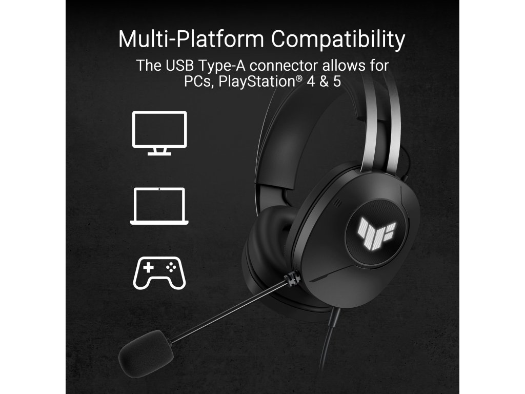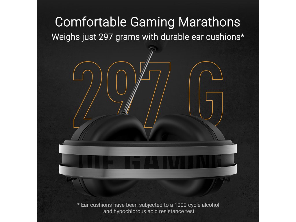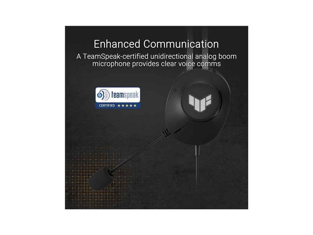 Káblová herná náhlavná súprava s 40mm meničmi ASUS Essence, virtuálny 7.1 priestorový zvuk, mikrofón s certifikáciou TeamSpeak, ľahká konštrukcia vážiaca 297 gramov, odolné náušníky a podsvietenie symbolického loga TUF