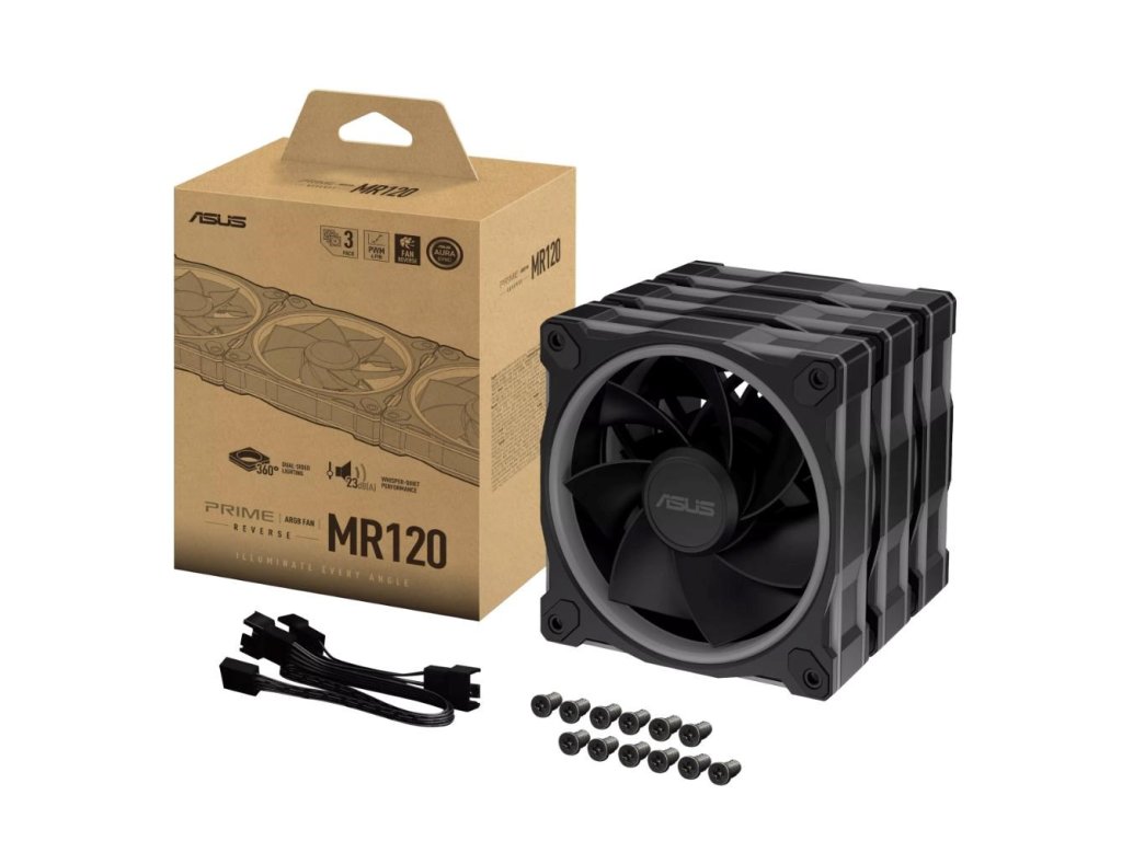Reverzný ventilátor ASUS Prime MR120 ARGB s obojstranným osvetlením na ráme a hrúbkou 28 mm poskytuje ideálny chladiaci výkon