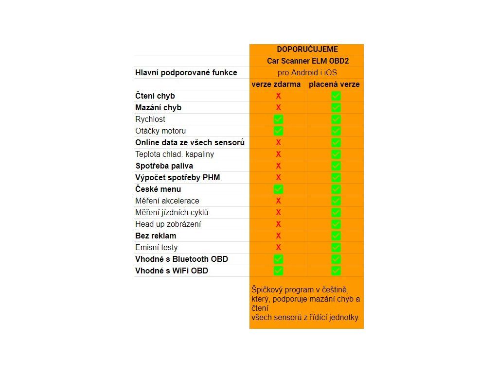 Ověřená OBD II diagnostika s vysokou kompatibilitou a výbornou diagnostickou aplikacíke stažení zdarma v demo verzi s možností placeného rozšíření. Kvalitní bezdrátová autodiagnostická jednotka pro běžné diagnostické funkce jako je čtení a mazání chyb nebo zobrazení online dat z dostupných senzorů. Funguje bez problémů na naprosté většině vozů, kde ostatní levné OBD selhaly a nenačetly data z řídící jednotky. Bluetooth Univerzální Auto Diagnostika umožňuje bezdrátový přenos ke čtení diagnostických chybových kódů a zobrazování jejich významů, více než 3000 kódů v databázi. Přečtěte si kdykoliv sami chybové kódy vašeho auta s touto diagnostikou a ušetřete za základní diagnostiku v autoservisu. Verze čipu 1.5 Oproti ostatním verzím 1.1 , 1,3 , nebo 2.1 podporuje čip ve verzi 1,5 nejvíce diagnostických protokolů a zajišťuje tak kompatibilitu pro co nejširší okruh osobních vozů od roku 2000 pro vozidla s benzínovými motory a od roku 2003 pro vozidla s naftovými motory. Hlavní vlastnosti a funkce: diagnostika OBD II je použitelná pro vozidla od roku 2000 s benzínovými motory a od roku 2003 pro vozidla s naftovými motory Čte a maže chyby řídicí jednotky motoru a zobrazuje live data Zobrazuje aktuální data ze senzorů Otáčky motoru, rychlost vozidla Vypočtená hodnota zatížení motoru, kyslíkové čidlo Teplota chladící kapaliny, teplota nasávaného vzduchu, průtok vzduchu Tlak paliva, tlak v sacím potrubí Absolutní poloha plynového pedálu Napětí lambda sondy, stav palivového systému a mnoho dalších funkcí kompatibilní s většinou diagnostických programů, viz níže Podporované operační systémy: Android Vhodné pro : Škoda, VW, Seat, Audi, Hyundai, Toyota, Renault, Opel, Citroen, Ford, Peugeot, Suzuki, Dacia, Mazda a další nebo všechna vozidla s benzínovým motorem od roku výroby 2000 všechna vozidla s dieselovým motorem od roku výroby 2003 Aplikace v českém jazyce v demo verzi k vyzkoušení zdarma ke stažení a s možností placeného rozšíření. Ve spolupráci s vývojářem jednoho z nejlépe hodnocených programů pro diagnostiku jsme pro vás připravili českou verzi programu Car Scanner ELM OBD2. Jedná se aplikaci s naprosto nejlepším hodnocením na Google Play. Ke stažení: ZDE pro Android https://play.google.com/store/apps/details?id=com.ovz.carscanner a ZDE pro iOS https://itunes.apple.com/us/app/car-scanner-elm-obd2/id1259933623?mt=8 Přehled hlavních funkcí a alternativní kompatibilní aplikace: Zde jsme pro Vás připravili přehled hlavních funkcí programu Car Scanner ELM OBD2 Další podporované a vyzkoušené aplikace: OBD2 Torque OBD Fusion OBD Autodoctor EOBD Facile Olivia Drive Carista UPOZORNĚNÍ: Množství zobrazovaných údajů se může lišit dle typu diagnostikovaného vozidla. Obsah balení OBD2 Bluetooth Diagnostika Párovací kód : 1234Dodatočné parametre