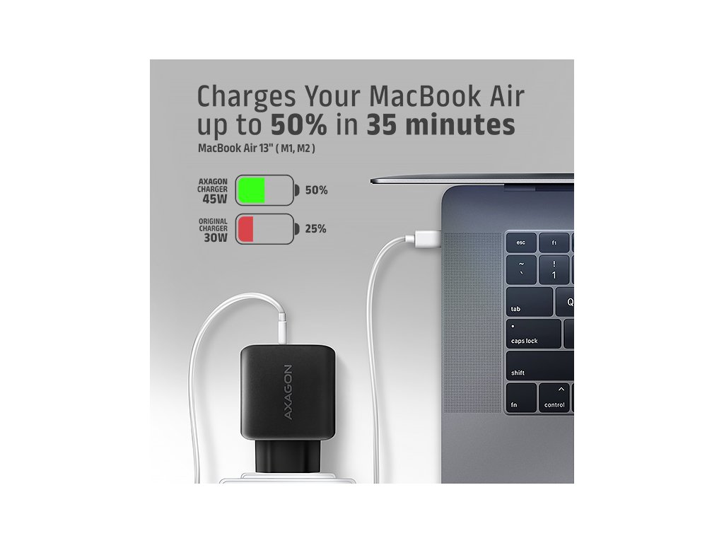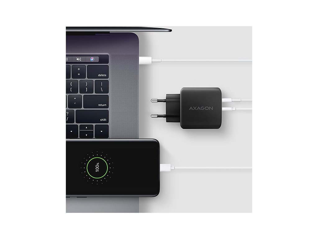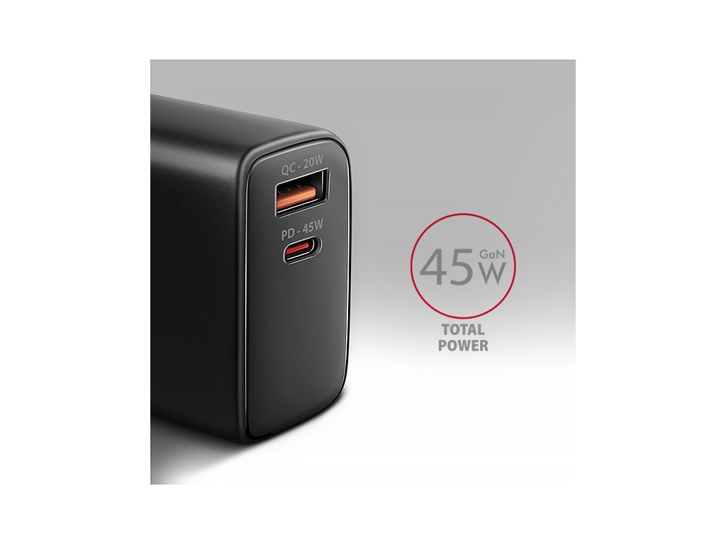 Cestovná nabíjačka AXAGON ACU-PQ45 GaN umožňuje rýchle nabíjanie až dvoch mobilných zariadení súčasne. S celkovým výkonom 45 W dokáže nabíjačka nabíjať telefóny, tablety a ďalšie mobilné zariadenia najvyššou možnou rýchlosťou. Adaptér ponúka nielen štandardný USB-A konektor, ale aj obojstranný USB-C konektor.