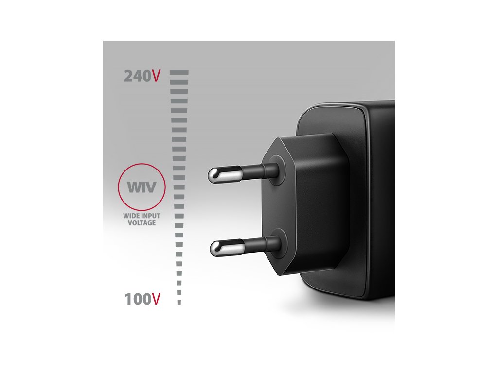 • Široké vstupné napätie - vyznačuje sa širokým rozsahom vstupného napätia, chráni adaptér pred podpätím a vstupným prepätím a umožňuje použitie viacerých "národných štandardov napájania".