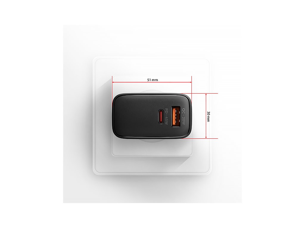 Telo napájacieho adaptéra má príjemný tvar a kompaktné rozmery. V porovnaní s bežnými nabíjacími adaptérmi s rovnakými parametrami je veľkosť tejto nabíjačky až o polovicu menšia. Kombinácia malých rozmerov, dosiahnutých pomocou technológie GaN, a širokého rozsahu vstupného napätia robí z tejto nabíjačky ideálneho pomocníka na cesty.