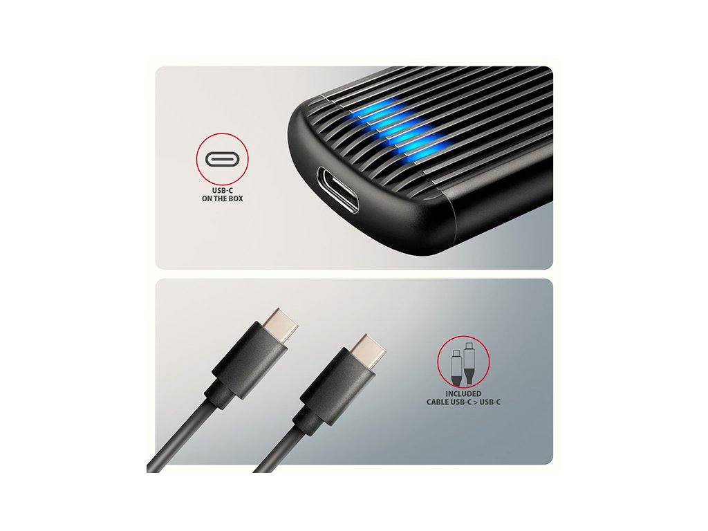 USB-C konektor. V balení naleznete kabel USB-C -> USB-C pro připojení boxu k počítači. Díky USB 10Gbps rozhraní je přenosová