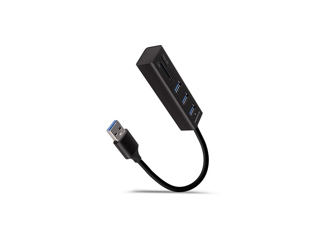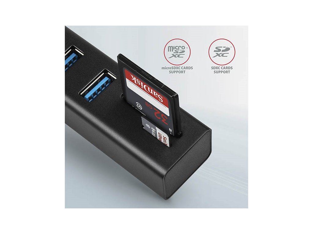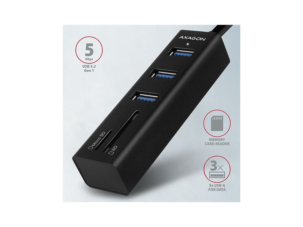 AXAGON HMA-CR3A, USB 3.rozbočovač 2. generácie, 3x porty USB-A + čítačka kariet SD/microSD, kov, 20 cm kábel USB-A