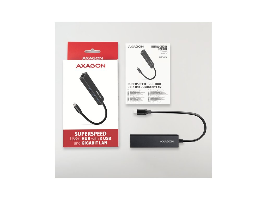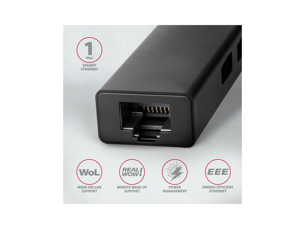 Štíhlý kovový USB-C 3.2 Gen 1 (USB 3.0) multi-port hub AXAGON HMC-GL3A nejen připojí k notebooku nebo počítači až tři USB zařízení současně, ale přidá také gigabitovou síťovou kartu, která připojí váš počítač k vysokorychlostní síti. Kovové tělo hubu je vyrobeno z hliníku a zajišťuje tak dokonalou mechanickou ochranu pro časté přenášení. Elegantní, jemně strukturovaný povrch brání nežádoucím otiskům. Napevno uchycený USB kabel délky 20 cm je ideální pro uživatele mobilních zařízení. Tento kompaktní multi portový hub také zvládne trvalé připojení několika externích disků. Díky rychlému USB 3.2 Gen 1 rozhraní je přenosová rychlost až 5Gb/s. Síťová karta rozšíří počítač o rychlé a stabilní síťové připojení, doplní chybějící síťový RJ-45 konektor nebo přidá další síťovou kartu. LAN adapter je kompatibilní s rychlostmi 10/100/1000 Mbit/s a nabízí také širokou škálu funkcí např. IPv4/IPv6 checksum pro snížení zátěže CPU kontrolními součty, crossover detekci a autokorekci, podporu různých módů Wake-on-LAN funkce, práce s VLAN nebo pokročilé funkce Power Managementu. V moderních operačních systémech od Windows 8.1 výše umožňuje adaptér snadnou automatickou instalaci bez nutnosti připojení k internetu. Replikátor portů je ideálním doplňkem pro ultrabooky s malým počtem USB-A portů a bez síťové karty. Rozbočovač se nezalekne ani připojení k telefonům s USB-C konektorem. K telefonu nebo tabletu tak připojíte například flash disk, klávesnici a myš. Některé telefony a tablety se systémem Android, například Samsung S9+, lze díky tomuto hubu připojit k internetu síťovým kabelem. Vstup: • 1x USB 3.2 Gen 1 / SuperSpeed USB port, konektor USB-C male. • Zpětně kompatibilní s USB 3.1 Gen 1 / USB 3.0 / USB 2.0 a USB 1.1. • Připojovací USB konektor typu C male (samec) umístěn na napevno uchyceném 20 cm kabelu. Výstupy USB: • 3x SuperSpeed USB port, konektory USB-A female. • Podpora přenosových rychlostí 5.000 / 480 / 12 / 1.5 Mb/s (SuperSpeed / High / Full / Low speed). • Celková propustnost / přenosová rychlost je dána použitým USB 3.2 Gen 1 rozhraním (teoreticky 5 Gbit/s). • USB hub zvládne připojení několika externích disků současně. Výstup RJ-45: • Rozhraní Gigabit Ethernet s RJ-45 konektorem pro připojení UTP nebo STP kabelem. • Podporované přenosové rychlosti Ethernet rozhraní 10/100/1000 Mb/s. • Podporované specifikace IEEE 802.3 10Base-T, IEEE 802.3u 100Base-TX, IEEE 802.3ab 1000Base-T. • 10/100/1000 Mb/s autodetekce. • Podpora IPv4/IPv6 packet Checksum Offload Engine (COE) pro snížení zatížení procesoru včetně IPv4 IP/TCP/UDP/ICMP/IGMP & IPv6 TCP/UDP/ICMPv6 kontroly a generování kontrolního součtu. • Podpora TCP Large Send Offload V1 a V2. • Podpora IEEE 802.1P Layer 2 priority encoding & decoding. • Podpora IEEE 802.1Q VLAN tagging. • Podpora IEEE 802.3az EEE (Energy Efficient Ethernet) - snížení spotřeby v klidovém stavu. • Podpora Jumbo frame. • Podpora full-duplex přenosů s IEEE 802.3x flow control i half-duplex přenosů s back-pressure flow control. • Podpora Auto MDI/MDIX - crossover detekce a autokorekce eliminuje potřebu crossover kabelů. • Podpora hardwarového Cyclic Redundancy Check (CRC) pro odhalení chyb přenosu. • Podpora pair swap/polarity/skew korekce. Funkce Wake-on-LAN v různých módech: • Podpora režimu spánku a vzdáleného probuzení přes Magic paket, Microsoft Wakeup Frame, Microsoft Wake Packet Detection a také Link Change wake-up. • Podpora standardu ECMA-393 proxZzzy® for sleeping hosts pro správu síťového připojení spících hostů pomocí proxy serverů. • Podpora technologie RealWoW! umožňuje vzdálené probouzení skrze internet. Pokročilé funkce Power Managementu: Adaptér podporuje pokročilou správu napájení redukující ztráty při klidovém stavu nebo lehkém provozu na síti. Dále podporuje pokročilou úsporu energie při odpojení Ethernet kabelu. • Podpora Advanced Configuration Power management Interface (ACPI). • Podpora Power Management offload (ARP & NS). • Podpora Microsoft Always On Always Connected (AOAC). • Podpora Intel Converged Platform Power Management (CPPM). • Podpora Link Power Management (LPM). • Podpora Operating System-directed Power Management (OSPM). • Podpora IEEE 802.3az EEE (Energy Efficient Ethernet). Další vlastnosti: • Možnost připojení zařízení za chodu díky podpoře Hot Plug. • Plná podpora Plug and Play. • Podpora úsporného režimu. • Kvalitní stíněný kabel zaručuje vysokou rychlost komunikace a minimální nežádoucí interference. • Podpora napájení po USB sběrnici (bus power). • Rozměry 90 x 23 x 13 mm. • Hmotnost 38 g (vč. kabelu). • Délka USB kabelu 20 cm. Podporované operační systémy: • MS Windows XP / Vista / 7 / 8 / 8.1 / 10 / 11 a novější, Windows Server 2003 / 2008 / 2012 / 2016 a novější (podporovány všechny 32- i 64-bitové verze OS Windows), Mac OS X 10.4.x a vyšší, Linux s jádrem 2.6.x a vyšším, Android většina verzí (POZOR - nutno ověřit u výrobce Android zařízení, zda je podporována možnost Ethernet připojení). Balení v kartonové krabičce s otvorem pro zavěšení obsahuje: • SuperSpeed USB-C multi rozbočovač s kabelem napevno délky 20 cm, • multijazyčný manuál CZ/DE/DK/ENG/ESP/FIN/FR/GR/HR/HU/IT/NL/PL/PT/RO/RU/SK/SWE/BG/CN/TR/ARA.Dodatočné parametre