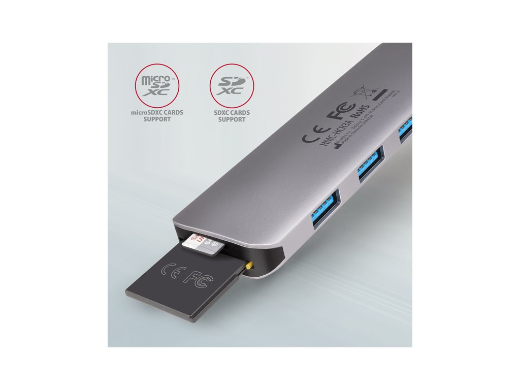 Viacportový USB-C 3.2 Gen 1 hub AXAGON HMC-HCR3A rozšíri váš notebook, počítač alebo telefón o štyri porty a čítačku pamäťových kariet SD/microSD. Prostredníctvom obojstranného USB-C konektora ľahko a rýchlo pripojíte k počítaču súčasne tri USB zariadenia, pamäťové karty a HDMI displej. Rozbočovač USB-C vám poskytne jednoduchú a kompaktnú dokovaciu stanicu 5 v 1 pre váš notebook.