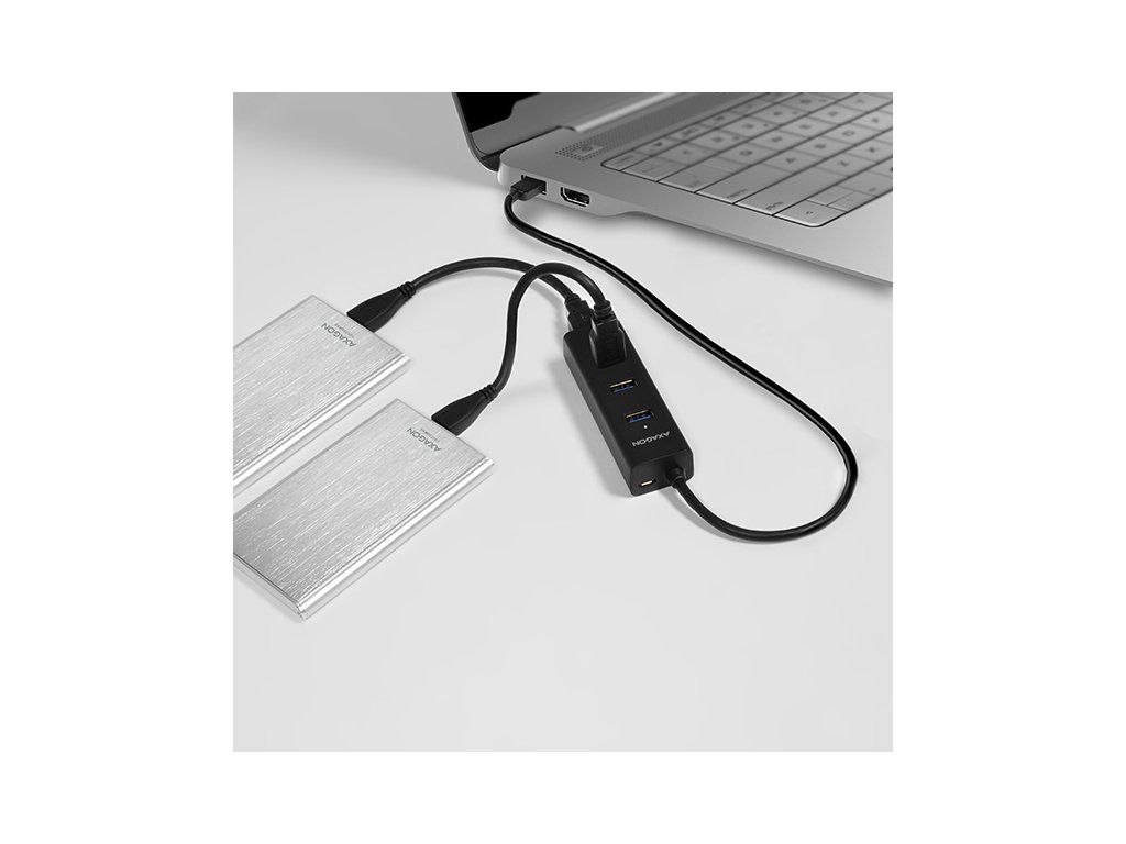 K rozbočovaču možno trvalo pripojiť viacero externých diskov bez externého napájania. Po pripojení externého napájania možno súčasne prevádzkovať tri externé disky. Krížovo umiestnené porty USB s dostatočným odstupom na priame a bezproblémové pripojenie veľkých zariadení USB.