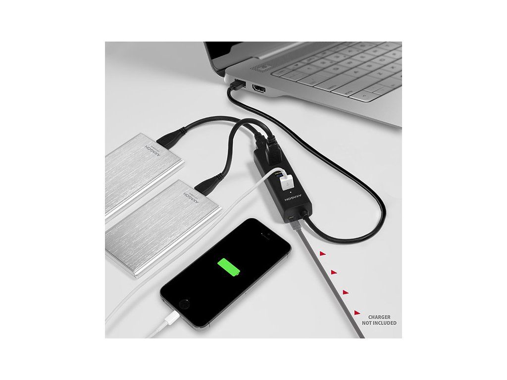 Veľkou výhodou je možnosť externého napájania z akejkoľvek nabíjačky mobilného zariadenia s konektorom micro USB. Vďaka nepoužívanej nabíjačke sa z tohto rozbočovača USB stane rýchlonabíjací rozbočovač zadarmo. Mobilné telefóny, tablety, powerbanky a ďalšie zariadenia možno nabíjať prúdom až 2 A (v závislosti od použitej nabíjačky) v ktoromkoľvek porte rozbočovača vďaka podpore nabíjania batérií USB 1.2. Podporuje nabíjanie tabletov iPad bez dodatočného napájania s cca. 1A (priamo z USB 3.0 porty v počítači zvyčajne nedokážu nabíjať iPad). Môže fungovať aj ako samostatný nabíjací rozbočovač a nabíjať zariadenia USB z napájacieho adaptéra, aj keď je počítač vypnutý alebo odpojený.
