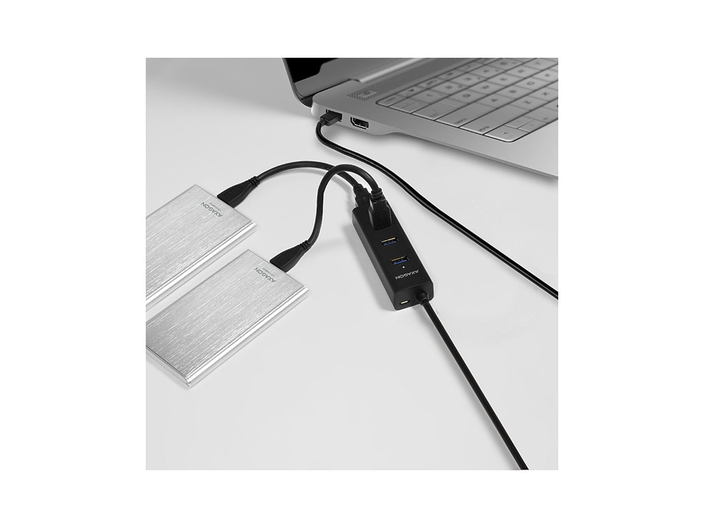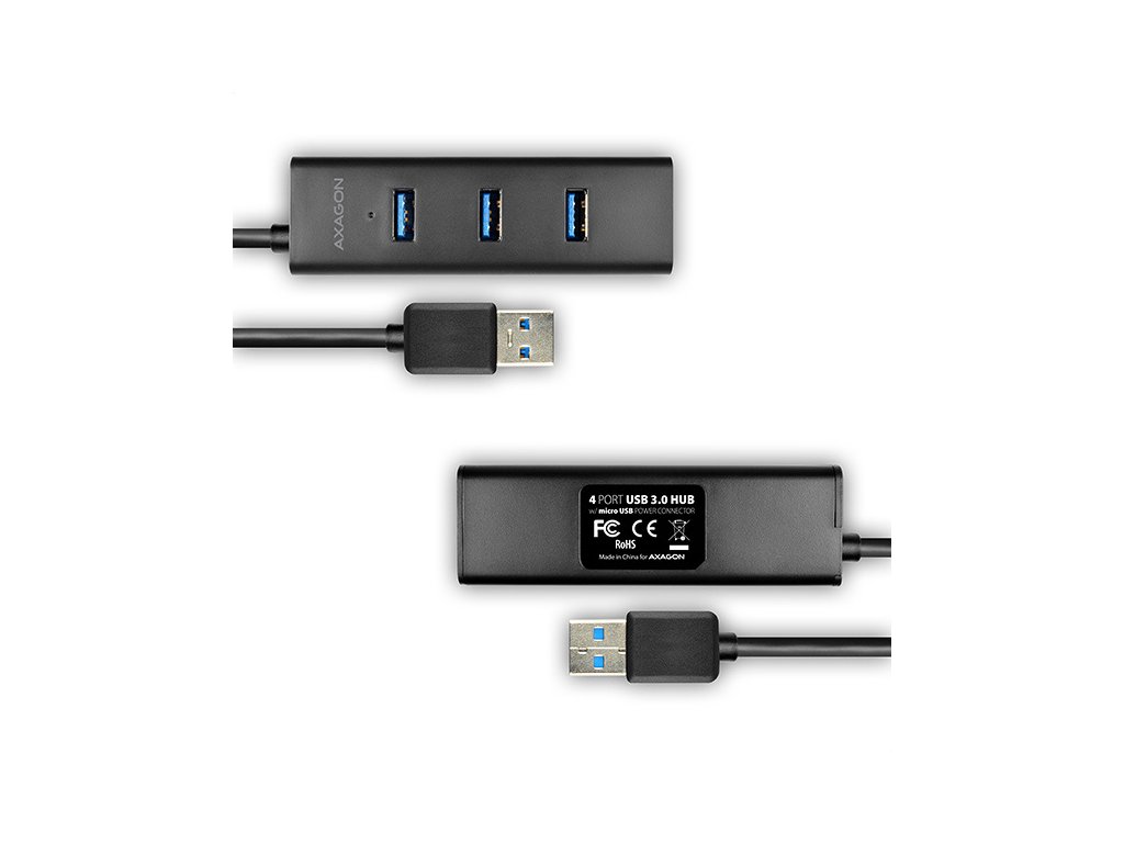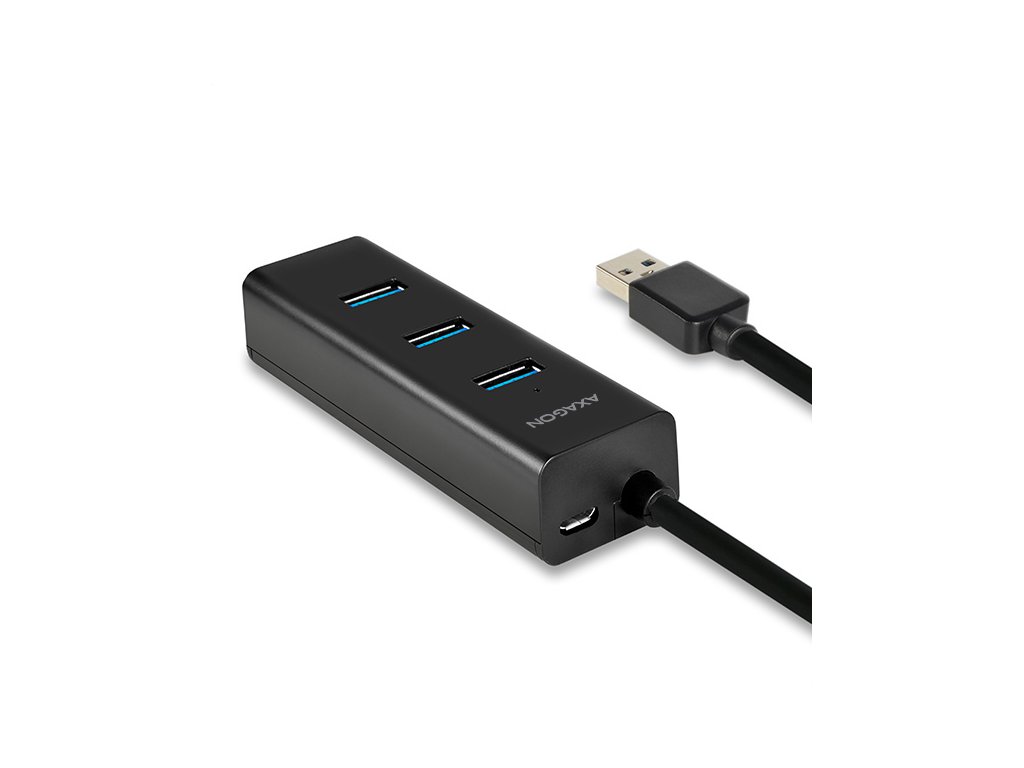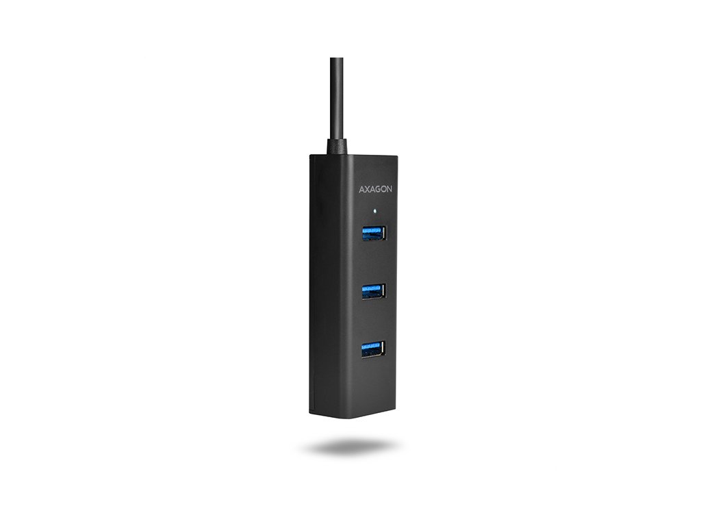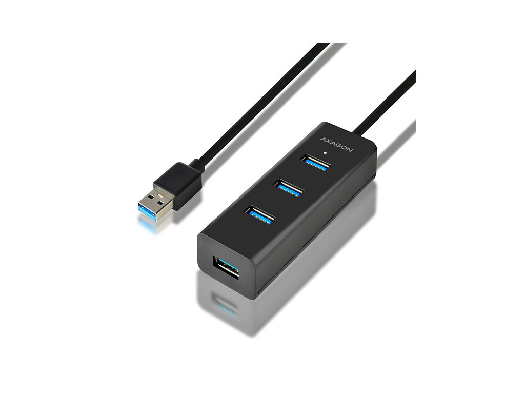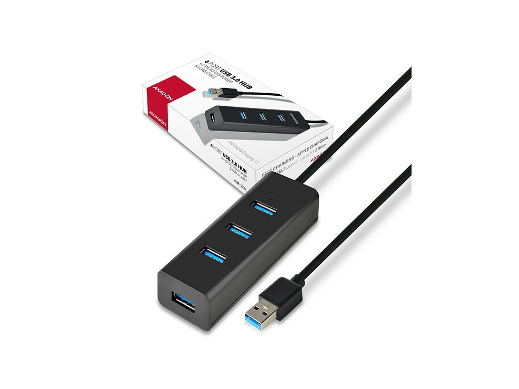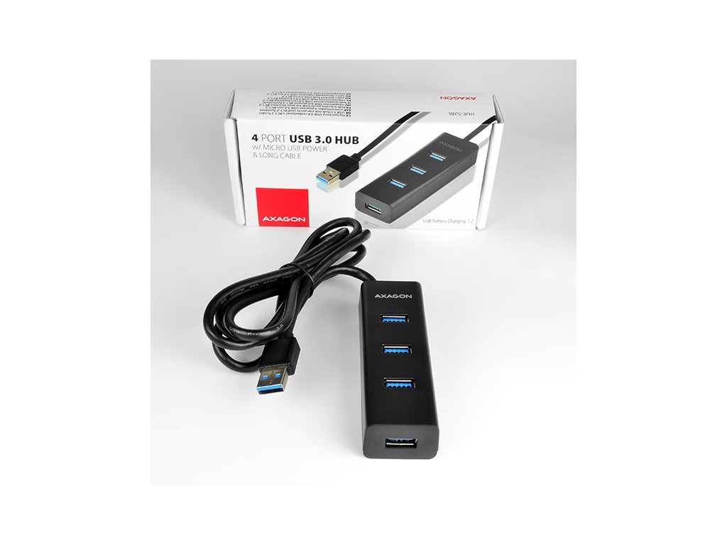 4-portový USB 3.0 hubAXAGON HUE-S2BL s USB kabelem dlouhým 1.2m, možností externího napájení a podporou rychlonabíjení na všech portech. Lehký malý rozbočovač s elegantním matným plastovým tělem připojí snadno a rychle k počítači až čtyři USB zařízení současně. Napevno uchycený 1.2 m dlouhý USB kabel je vhodný pro použití se stolním počítačem. Velkou výhodou je možnost externího napájení hubu z jakékoliv nabíječky mobilních zařízení s micro USB konektorem. Nevyužitá nabíječka tak zadarmo udělá z tohoto USB hubu rychlonabíjecí hub. Mobilní telefony, tablety, powerbanky a další zařízení lze nabíjet proudem až 2A (závisí na použité nabíječce) v kterémkoliv portu hubu díky podpoře USB Battery Charging 1.2. Podpora nabíjení tabletů iPad i bez přídavného napájení proudem cca. 1A (přímo z USB 3.0 portů na počítači většinou iPad nabíjet nelze). Může fungovat i jako samostatný charging hub a nabíjet USB zařízení z napájecího adaptéru i po vypnutí nebo odpojení počítače. Zvládne trvalé připojení několika externích disků i bez externího napájení hubu. Po připojení externího napájení lze pracovat i se třemi externími disky současně. Napříč umístěné USB porty s dostatečným rozestupem pro přímé bezproblémové připojení rozměrných USB zařízení.