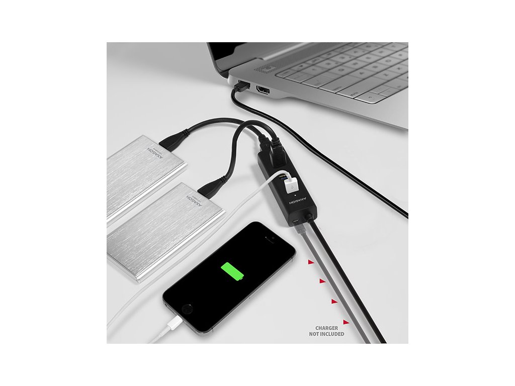Režim vlastního napájení hubu z USB nabíječky - není součástí balení (self power): • Lze použít jakoukoliv nabíječku mobilních zařízení s micro USB konektorem (doporučený výstupní proud nabíječky 2A). • USB hub v tomto režimu napájení zvládne 3 magnetické 2.5'' externí disky. Pro spolehlivý dlouhodobý provoz hubu však doporučujeme připojení max. 2 magnetických externích 2.5'' disků současně. • Rychlonabíjení mobilních zařízení (včetně iPad) proudem až 2A v každém z portů hubu. Celkový proud dodávaný hubem při nabíjení je omezen výstupním proudem externího napájecího adapteru.