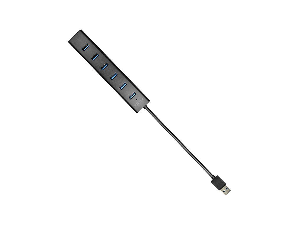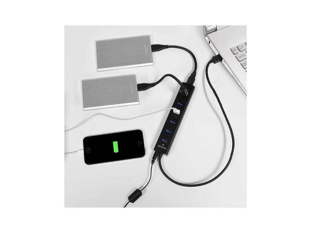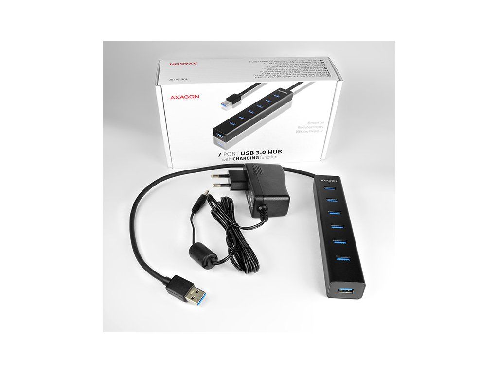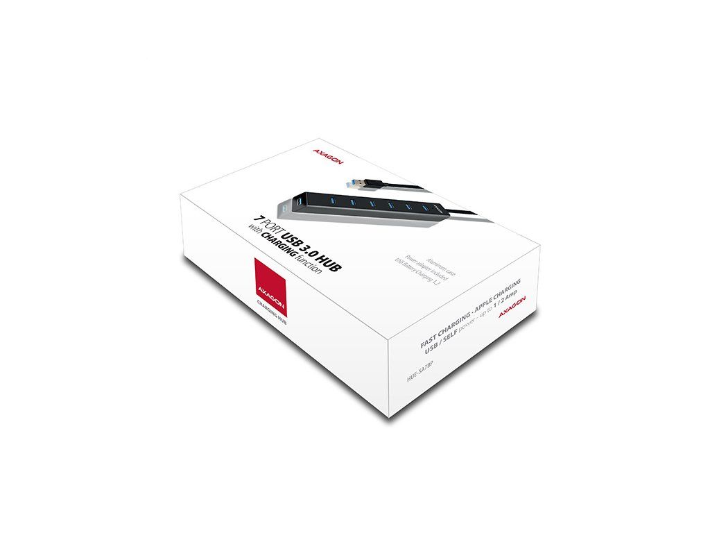 7-portový USB 3.0 hub AXAGON HUE-SA7BP ALU CHARGING s vlastným zdrojom napájania a podporou rýchleho nabíjania na všetkých portoch USB. Kompaktný rozbočovač s odolným hliníkovým puzdrom pripojí k počítaču až sedem zariadení USB súčasne. Pevný USB kábel s dostatočnou dĺžkou 40 cm ideálny na použitie s notebookmi.