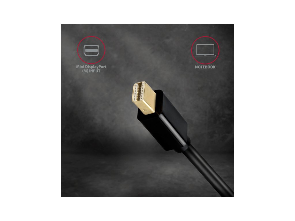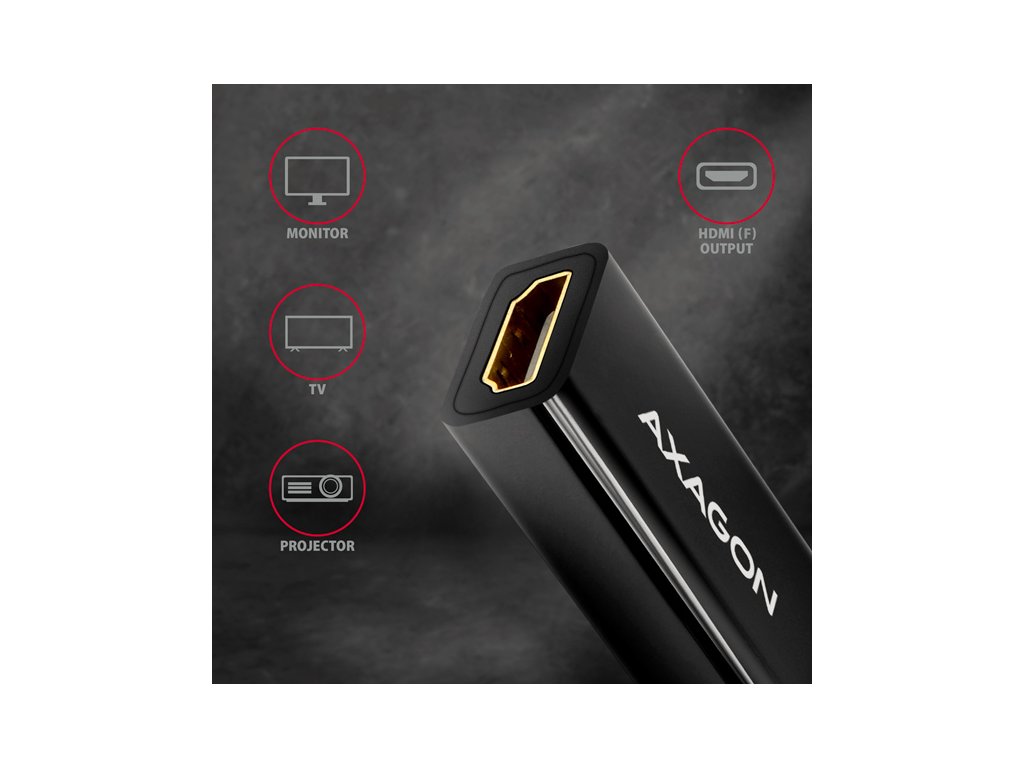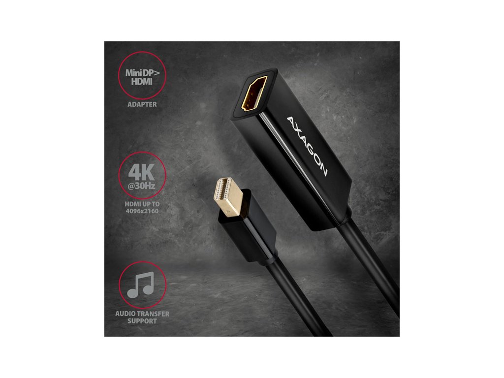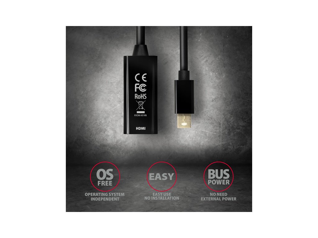 Aktívny adaptérMini DisplayPort -> HDMI AXAGON RVDM-HI14N na pripojenie HDMI monitora/TV/projektora k počítaču s výstupom Mini DisplayPort.