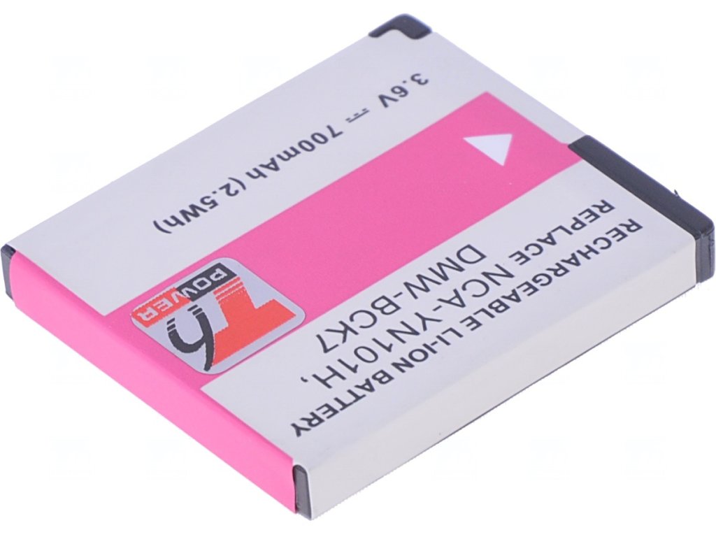 Typ: Li-ion Kapacita: 700 mAh (2.5 Wh) Barva: černá Napětí: 3.6 V Rozměry: 41x36.2x5.5 mm Hmotnost: 16.5 g Produktová čísla: DMW-BCK7, DMW-BCK7E, NCA-YN101F, NCA-YN101G, NCA-YN101H Kompatibilní modely: Panasonic DMC-FT25, Panasonic DMC-FT25A, Panasonic DMC-FT25K, Panasonic DMC-FT25R, Panasonic DMC-FT25W, Panasonic DMC-TS25, Panasonic DMC-TS25A, Panasonic DMC-TS25K, Panasonic DMC-TS25R, Panasonic DMC-TS25W, Panasonic Lumix DMC-FH2, Panasonic Lumix DMC-FH24, Panasonic Lumix DMC-FH25, Panasonic Lumix DMC-FH25A, Panasonic Lumix DMC-FH25K, Panasonic Lumix DMC-FH25R, Panasonic Lumix DMC-FH25S, Panasonic Lumix DMC-FH25V, Panasonic Lumix DMC-FH27, Panasonic Lumix DMC-FH27K, Panasonic Lumix DMC-FH27R, Panasonic Lumix DMC-FH27S, Panasonic Lumix DMC-FH2A, Panasonic Lumix DMC-FH2K, Panasonic Lumix DMC-FH2P, Panasonic Lumix DMC-FH2R, Panasonic Lumix DMC-FH2S, Panasonic Lumix DMC-FH4, Panasonic Lumix DMC-FH4K, Panasonic Lumix DMC-FH4P, Panasonic Lumix DMC-FH4S, Panasonic Lumix DMC-FH5, Panasonic Lumix DMC-FH5K, Panasonic Lumix DMC-FH5N, Panasonic Lumix DMC-FH5P, Panasonic Lumix DMC-FH5S, Panasonic Lumix DMC-FH5V, Panasonic Lumix DMC-FH6, Panasonic Lumix DMC-FH6A, Panasonic Lumix DMC-FH6K, Panasonic Lumix DMC-FH6P, Panasonic Lumix DMC-FH6S, Panasonic Lumix DMC-FH6Y, Panasonic Lumix DMC-FH7, Panasonic Lumix DMC-FH7K, Panasonic Lumix DMC-FH7N, Panasonic Lumix DMC-FH7P, Panasonic Lumix DMC-FH7S, Panasonic Lumix DMC-FH8, Panasonic Lumix DMC-FH8K, Panasonic Lumix DMC-FH8N, Panasonic Lumix DMC-FH8R, Panasonic Lumix DMC-FH8S, Panasonic Lumix DMC-FH8V, Panasonic Lumix DMC-FP5, Panasonic Lumix DMC-FP5A, Panasonic Lumix DMC-FP5G, Panasonic Lumix DMC-FP5K, Panasonic Lumix DMC-FP5P, Panasonic Lumix DMC-FP5S, Panasonic Lumix DMC-FP7, Panasonic Lumix DMC-FP77, Panasonic Lumix DMC-FP7A, Panasonic Lumix DMC-FP7K, Panasonic Lumix DMC-FP7N, Panasonic Lumix DMC-FP7P, Panasonic Lumix DMC-FP7R, Panasonic Lumix DMC-FP7S, Panasonic Lumix DMC-FS14, Panasonic Lumix DMC-FS16, Panasonic Lumix DMC-FS16A, Panasonic Lumix DMC-FS16K, Panasonic Lumix DMC-FS16P, Panasonic Lumix DMC-FS16R, Panasonic Lumix DMC-FS16S, Panasonic Lumix DMC-FS18, Panasonic Lumix DMC-FS18K, Panasonic Lumix DMC-FS18N, Panasonic Lumix DMC-FS18P, Panasonic Lumix DMC-FS18S, Panasonic Lumix DMC-FS18V, Panasonic Lumix DMC-FS22, Panasonic Lumix DMC-FS22K, Panasonic Lumix DMC-FS22N, Panasonic Lumix DMC-FS22P, Panasonic Lumix DMC-FS22S, Panasonic Lumix DMC-FS28, Panasonic Lumix DMC-FS28K, Panasonic Lumix DMC-FS28P, Panasonic Lumix DMC-FS28S, Panasonic Lumix DMC-FS35, Panasonic Lumix DMC-FS35A, Panasonic Lumix DMC-FS35K, Panasonic Lumix DMC-FS35R, Panasonic Lumix DMC-FS35S, Panasonic Lumix DMC-FS35V, Panasonic Lumix DMC-FS37, Panasonic Lumix DMC-FS37K, Panasonic Lumix DMC-FS37R, Panasonic Lumix DMC-FS37S, Panasonic Lumix DMC-FS40, Panasonic Lumix DMC-FS40A, Panasonic Lumix DMC-FS40K, Panasonic Lumix DMC-FS40P, Panasonic Lumix DMC-FS40S, Panasonic Lumix DMC-FS40Y, Panasonic Lumix DMC-FS41, Panasonic Lumix DMC-FS45, Panasonic Lumix DMC-FS45K, Panasonic Lumix DMC-FS45N, Panasonic Lumix DMC-FS45R, Panasonic Lumix DMC-FS45S, Panasonic Lumix DMC-FS45V, Panasonic Lumix DMC-FT20, Panasonic Lumix DMC-FT20A, Panasonic Lumix DMC-FT20D, Panasonic Lumix DMC-FT20K, Panasonic Lumix DMC-FT20R, Panasonic Lumix DMC-FX77, Panasonic Lumix DMC-FX77A, Panasonic Lumix DMC-FX77K, Panasonic Lumix DMC-FX77N, Panasonic Lumix DMC-FX77P, Panasonic Lumix DMC-FX77S, Panasonic Lumix DMC-FX77W, Panasonic Lumix DMC-FX78, Panasonic Lumix DMC-FX78A, Panasonic Lumix DMC-FX78K, Panasonic Lumix DMC-FX78N, Panasonic Lumix DMC-FX78P, Panasonic Lumix DMC-FX78S, Panasonic Lumix DMC-FX78W, Panasonic Lumix DMC-FX80, Panasonic Lumix DMC-FX80K, Panasonic Lumix DMC-FX80N, Panasonic Lumix DMC-FX80P, Panasonic Lumix DMC-FX80V, Panasonic Lumix DMC-FX90, Panasonic Lumix DMC-FX90K, Panasonic Lumix DMC-S1, Panasonic Lumix DMC-S1A, Panasonic Lumix DMC-S1K, Panasonic Lumix DMC-S1N, Panasonic Lumix DMC-S1P, Panasonic Lumix DMC-S1S, Panasonic Lumix DMC-S1W, Panasonic Lumix DMC-S2, Panasonic Lumix DMC-S2K, Panasonic Lumix DMC-S2V, Panasonic Lumix DMC-S3, Panasonic Lumix DMC-S3A, Panasonic Lumix DMC-S3K, Panasonic Lumix DMC-S3P, Panasonic Lumix DMC-S3R, Panasonic Lumix DMC-S3V, Panasonic Lumix DMC-S3W, Panasonic Lumix DMC-S5, Panasonic Lumix DMC-S5K, Panasonic Lumix DMC-S5R, Panasonic Lumix DMC-S5S, Panasonic Lumix DMC-SZ02, Panasonic Lumix DMC-SZ1, Panasonic Lumix DMC-SZ1A, Panasonic Lumix DMC-SZ1K, Panasonic Lumix DMC-SZ1R, Panasonic Lumix DMC-SZ1S, Panasonic Lumix DMC-SZ1V, Panasonic Lumix DMC-SZ7, Panasonic Lumix DMC-SZ7K, Panasonic Lumix DMC-SZ7P, Panasonic Lumix DMC-SZ7T, Panasonic Lumix DMC-SZ7W, Panasonic Lumix DMC-TS20, Panasonic Lumix DMC-TS20A, Panasonic Lumix DMC-TS20D, Panasonic Lumix DMC-TS20K, Panasonic Lumix DMC-TS20R, Panasonic Lumix DMC-FT30, Panasonic Lumix DMC-TS30, Panasonic Lumix DMC-SZ5Dodatočné parametre