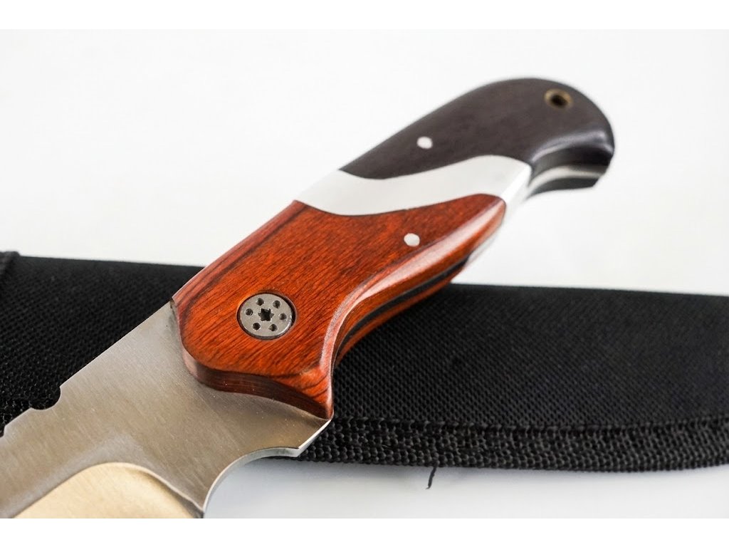 Skutočným šperkom tohto modelu je ergonomicky tvarovaná rukoväť. Je vyrobená z kombinácie tmavého a červenohnedého lešteného dreva, ktoré sú od seba oddelené elegantnou vlnovkou z kovu. Celkový dojem podčiarkuje centrálny mozaikový nit a otvor na poistnú šnúru s mosadznou vložkou. Rukoväť je tvarovaná tak, aby bezpečne sedela v dlani a poskytovala ochranu prstov pred skĺznutím. K nožu je dodávané praktické čierne nylonové puzdro s pútkom na opasok.