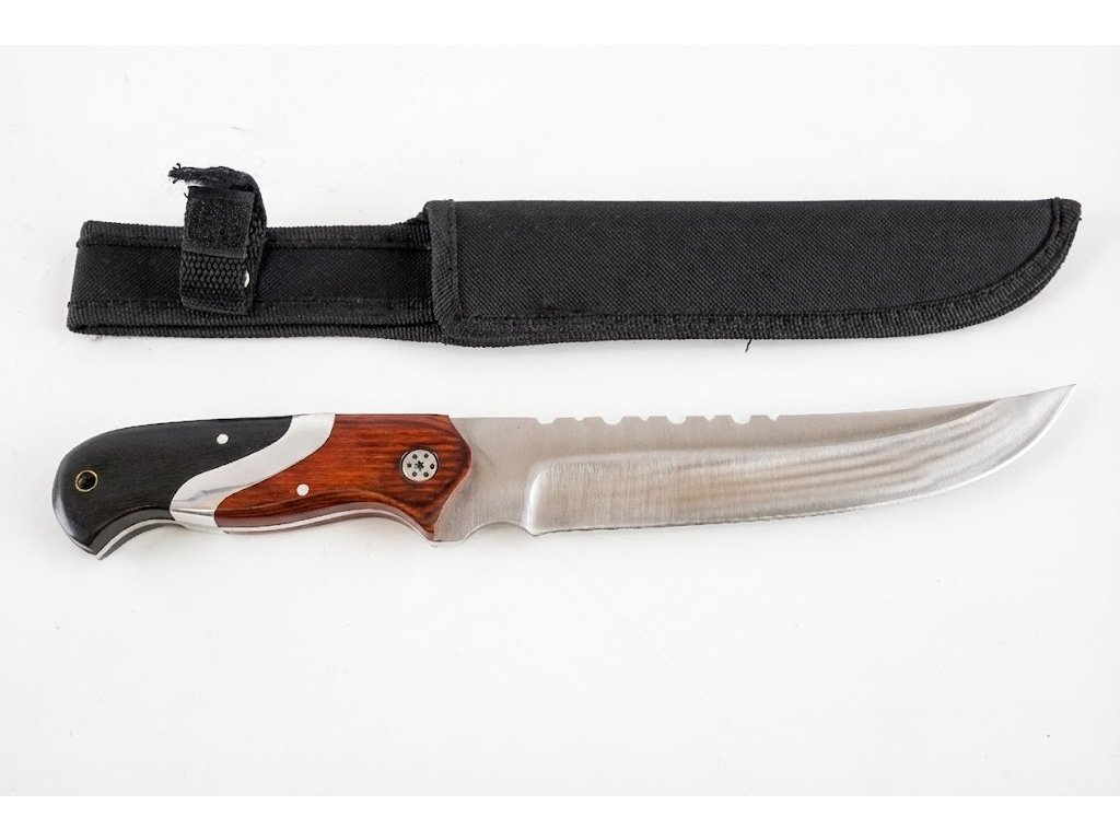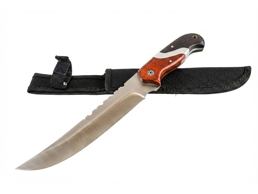 Tento masívny outdoorový nôž okamžite zaujme svojou prepracovanou čepeľou z kvalitnej ocele 440, ktorá je známa svojou odolnosťou a schopnosťou dlho držať ostrie. Čepeľ má špecifický tvar s výrazným bruškom pre vynikajúce rezné vlastnosti a na chrbte je zdobená dekoratívnym pílovaním (jimpingom). Vďaka konštrukcii full-tang, kde oceľ prechádza celou dĺžkou noža až po koniec rukoväte, je tento model mimoriadne pevný a spoľahlivý aj pri ťažších úkonoch v teréne.