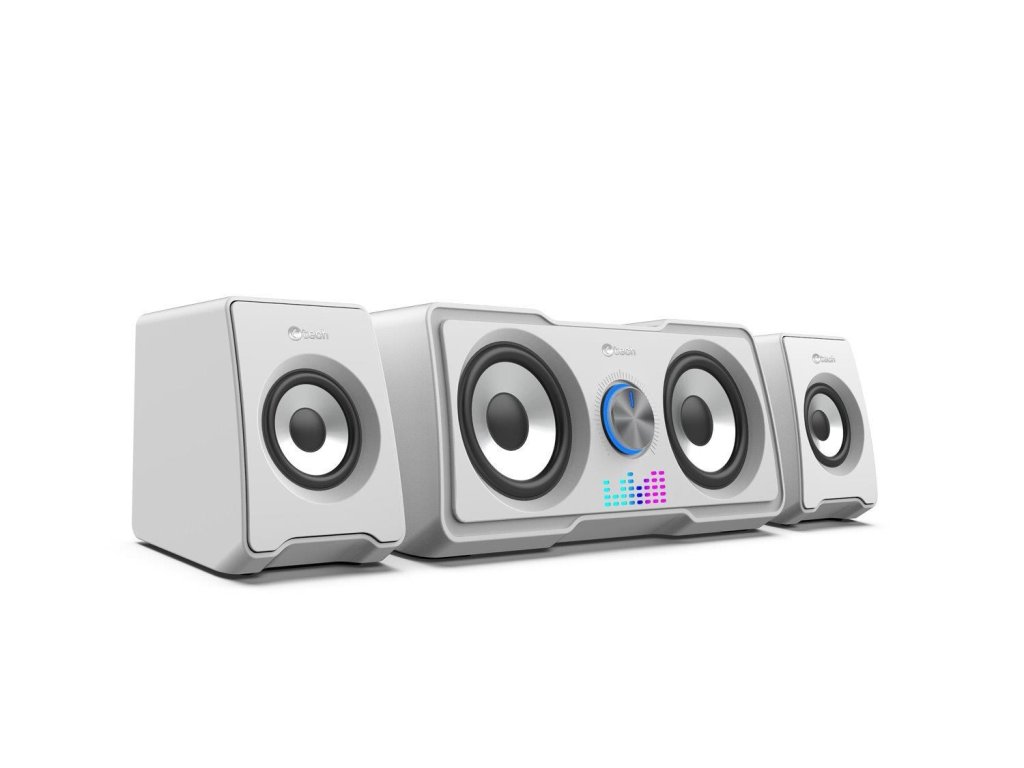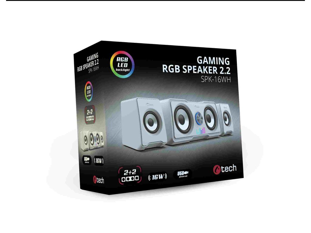Kompaktné PC reproduktory C-tech SPK-16WH 2.2 vám sprostredkujú kvalitný zvuk s výkonom 16W a frekvenčným rozsahom 150-20kHz. Vďaka unikátnej kombinácii meničov 2+2 je reprodukovaný zvuk bohatší a viac dynamický, takže si ho využijete nielen pri počúvaní obľúbených skladieb, ale aj pri hraní hier. O jedinečnú atmosféru pri počúvaní hudby sa postará automatické RGB podsvietenie. K ovládaniu hlasitosti poslúži regulátor nachádzajúci sa na jednom z reproduktorov. Tento regulátor slúži na zapnutie a vypnutie zariadenia. Pripojenie sústavy k zariadeniam zabezpečí kábel s 3,5mm jackom, napájanie zase USB kábel.