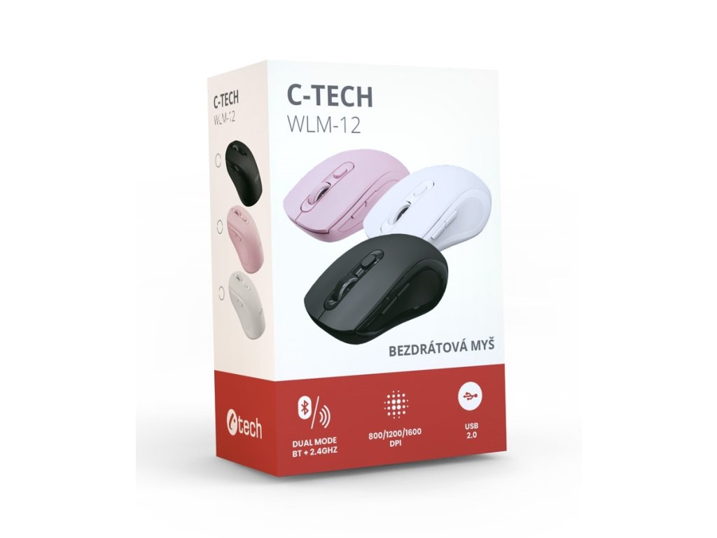 Nová bezdrátová myš C-tech WLM-12 přináší pokročilou technologii a pohodlný design pro maximální uživatelský komfort. Hlavním lákadlem této myši je její podpora Dual mode režimu, který umožňuje uživatelům volit mezi dvěma různými způsoby připojení podle svých preferencí. První možností je bezdrátové připojení pomocí Bluetooth technologie. Tato volba je ideální pro ty, kteří chtějí eliminovat nepořádek spojený s kabely a hledají flexibilitu připojení k různým zařízením. Díky Bluetooth spojení můžete myš snadno propojit s vaším počítačem, notebookem nebo dokonce chytrým zařízením bez nutnosti přidávání jakýchkoli adaptérů. Druhou možností je klasické připojení pomocí 2.4GHz technologie pomocí dodávaného USB dongle. S rozlišením 1600dpi zajišťuje C-tech WLM-12 přesnost a citlivost pro hladké a přesné pohyby na obrazovce. Díky tomu můžete efektivně pracovat, surfovat po internetu nebo si užívat zábavu bez zbytečného zpomalení či trhání kurzoru. C-tech WLM-12 se může pochlubit elegantním, ergonomicky tvarovaným designem, který umožní pohodlné ovládání po dlouhou dobu. Myš je k dispozici ve třech elegantních barvách: klasické černé, čistě bílé a nápadně růžové. Tím si každý uživatel může vybrat barvu, která nejlépe vyhovuje jeho osobnímu stylu a pracovnímu prostředí. Specifikace : Rozhraní: Bluetooth, Wireless 2.4GHz band, dosah signálu až 10m Nano receiver: USB 2.0 Rozlišení: 800-1200-1600 DPI 6 tlačítek Napájení: 1x AA baterie (součástí balení) Rozměry : 106x66x35mm Váha : 86gDodatočné parametre