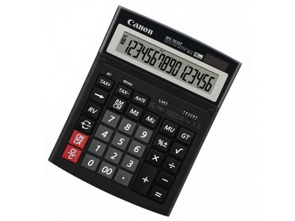 Canon WS-1610T 16místná stolní kalkulačka s funkcemi pro výpočet daně a přívětivou klávesnicí v duchu IT Tato 16místná stolní kalkulačka je vybavena funkcemi pro výpočet daně a nastavitelným panelem displeje LCD. Je vybavena klávesnicí v duchu IT, duálním zdrojem napájení a profesionálním černým provedením. Výhody - Funkce pro výpočet daně a navíc široká řada dalších funkcí - Nastavitelný panel displeje LCD - Klávesnice v duchu IT - Duální napájení: solární článek a baterie - Kompaktní a lehký model s elegantním a profesionálním vzhledem Kompletní funkce, včetně výpočtu daně 16místná kalkulačka WS-1610T nabízí širokou řadu funkcí. Tři klávesy funkce pro výpočet daně si s daňovými sazbami poradí jediným dotykem. Jednoduchý posuvný volič pro desetinnou čárku a zaokrouhlování. Paměť celkového součtu automaticky sčítá hodnoty. Další pohodlná tlačítka zahrnují tlačítka Zvýšení, Změny znaménka, Obrátit a všechny obvyklé funkce, které od kalkulačky společnosti Canon očekáváte.Dodatočné parametre