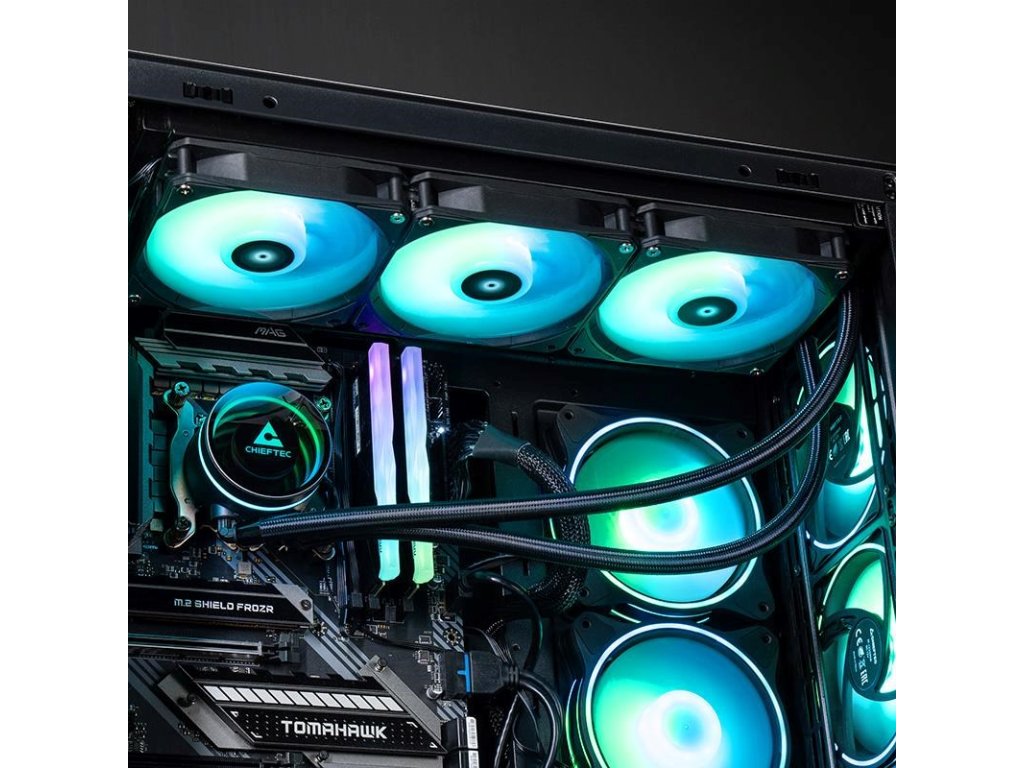 CHIEFTEC ICEBERG je všestranný chladič CPU s 360 mm vodným chladičom a ARGB snap-on ventilátormi s PWM zámkami pre zabezpečenie vynikajúceho odvodu tepla. S rýchlosťou ventilátora až 2200 otáčok za minútu poskytuje efektívne chladenie pre širokú škálu procesorov.