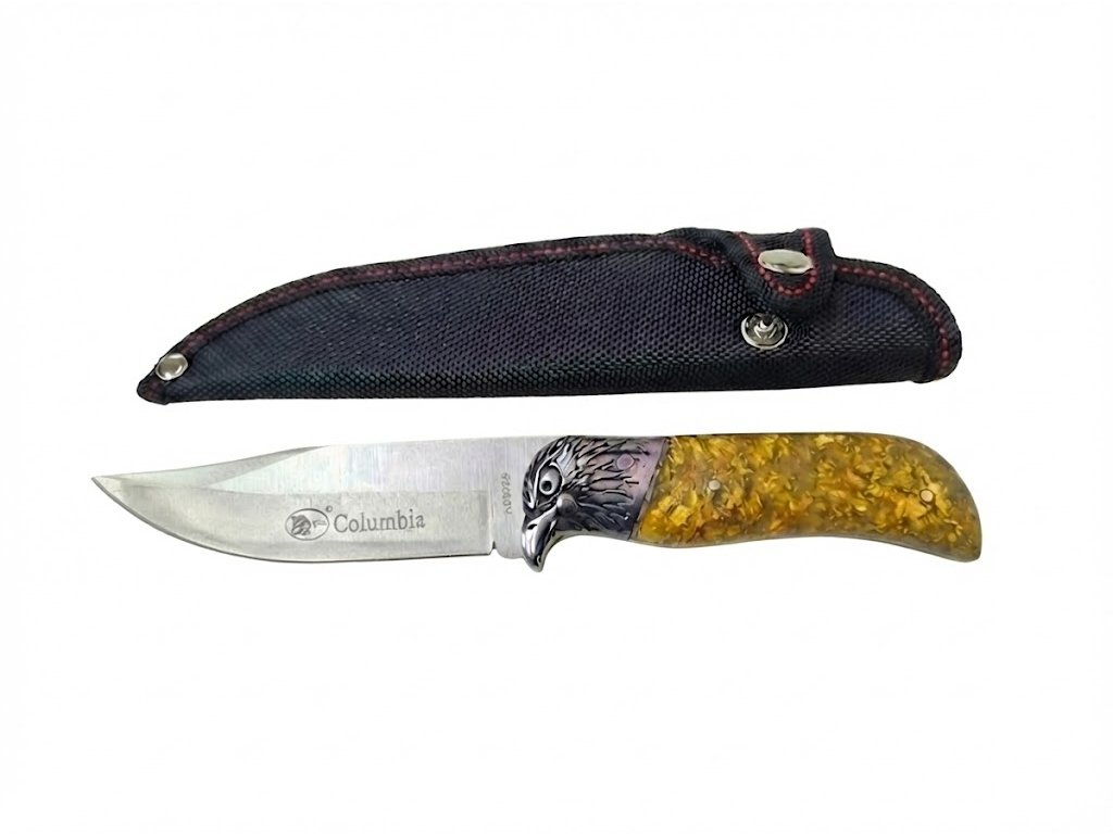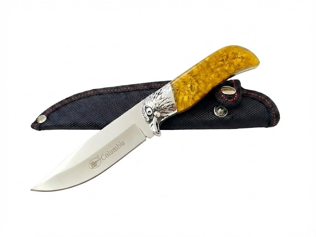 Pevná dýka Columbia KB3268 predstavuje dokonalé spojenie funkčnosti a umeleckého dizajnu, ktorý zaujme na prvý pohľad. Dominantným prvkom tohto modelu je kovová záštita, precízne vytvarovaná do podoby hlavy orla, ktorá plynule prechádza do ergonomickej rukoväte. Črienky sú vyrobené z odolného syntetického materiálu pripomínajúceho jantár, v ktorom sú zaliate zlatisté úlomky, čo nožu dodáva jedinečný, luxusný vzhľad a hĺbku.