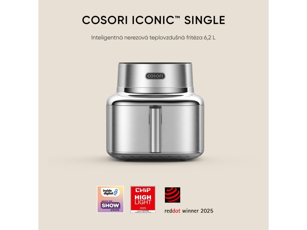 COSORI Iconic nie je len ďalšia fritéza – je to tiché dizajnové manifest pre modernú kuchyňu. Minimalistické línie, ušľachtilá nehrdzavejúca oceľ a tvrdené sklo vytvárajú objekt, ktorý vyzerá skôr ako štýlový doplnok než ako spotrebič. Každý detail je navrhnutý tak, aby prinášal pokoj, rovnováhu a radosť z používania. Víťaz ocenenia Red Dot Design Award 2025 dokazuje, že krása a funkčnosť idú ruka v ruke.