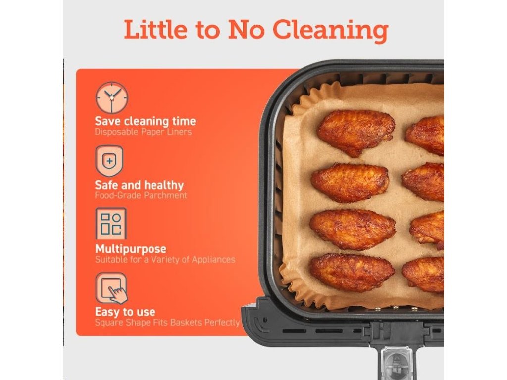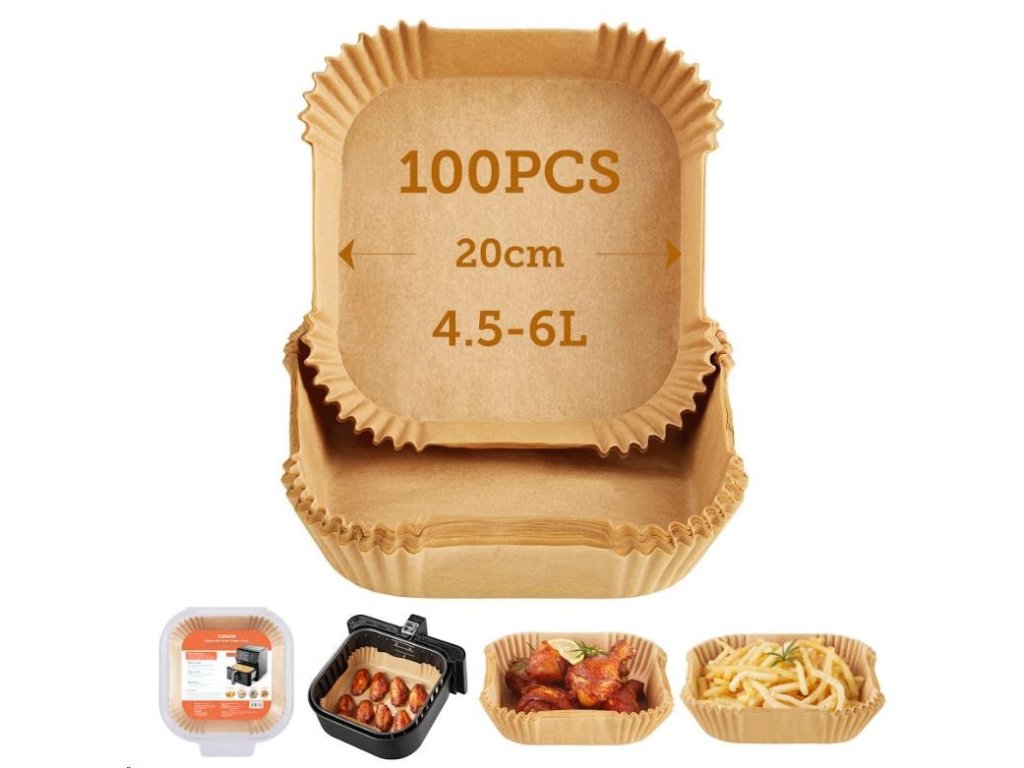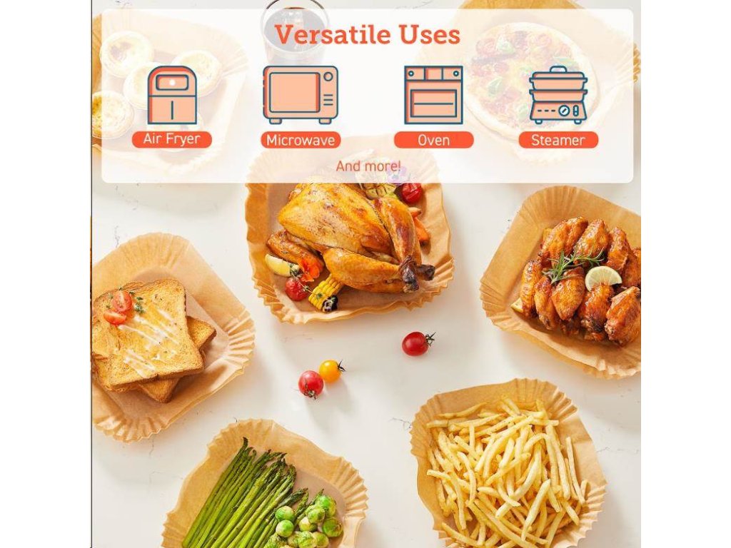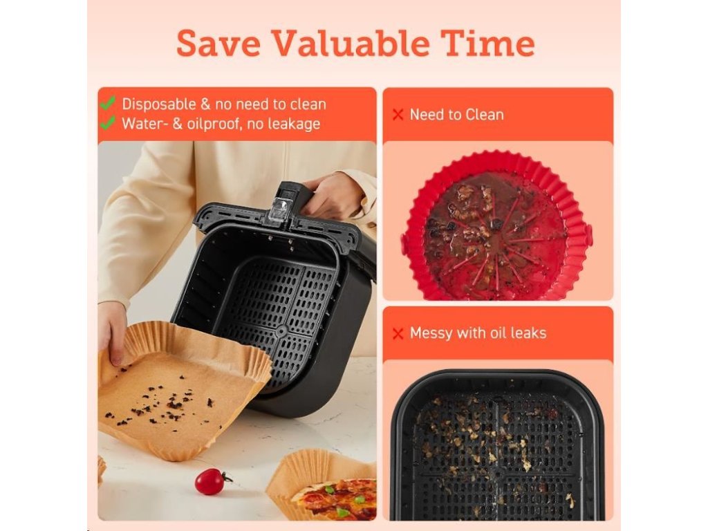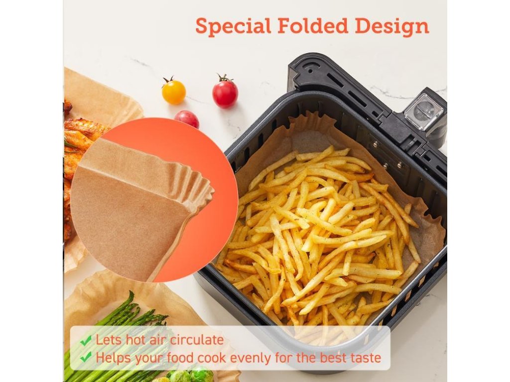 Štvorcové jednorazové papiere na pečenie pre teplovzdušné fritézy sú navrhnuté tak, aby sa prispôsobili tvaru koša fritézy, takže ich nemusíte trhať ani strihať. Keď ste pripravení piecť, jednoducho ich vložte do koša.