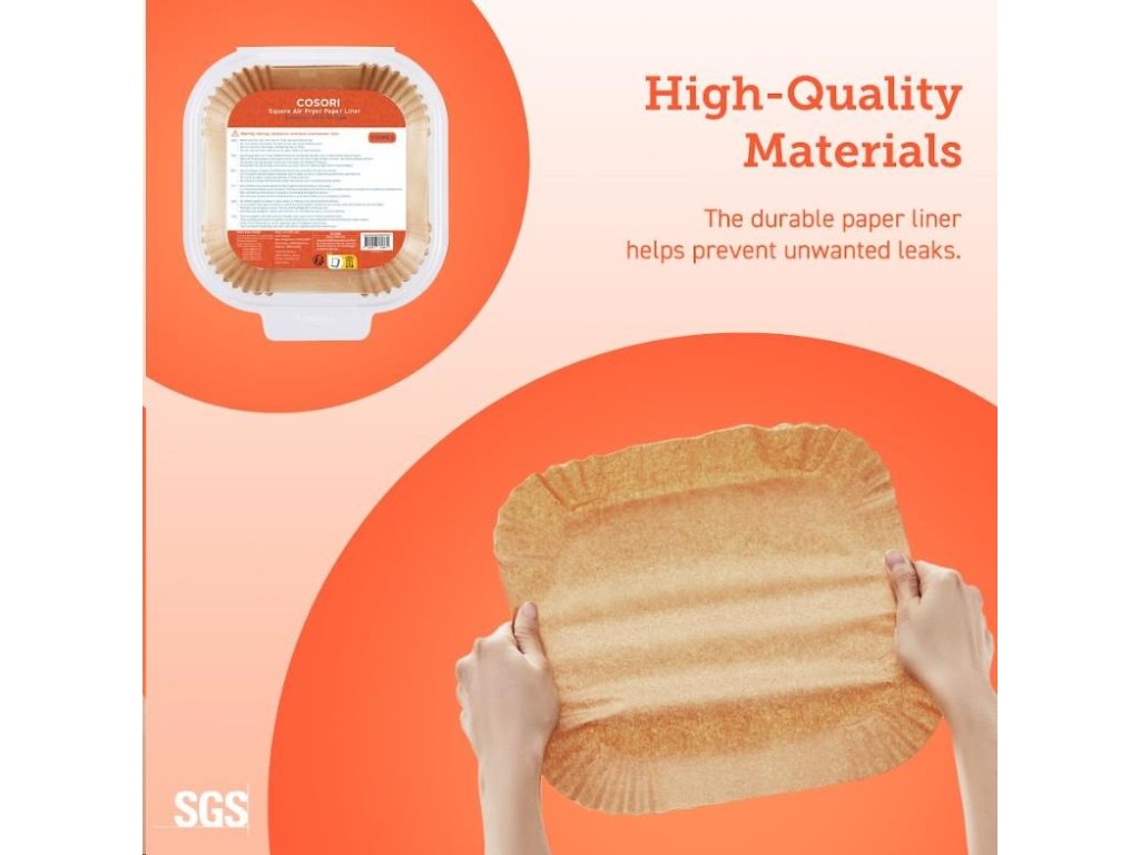 Papiere na pečenie COSORI sú vyrobené z netoxického a nebieleného potravinárskeho materiálu bez vosku a možno ich zahrievať až do 230 °C, čo je najvyššia teplota v teplovzdušnej fritéze.