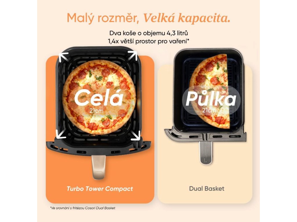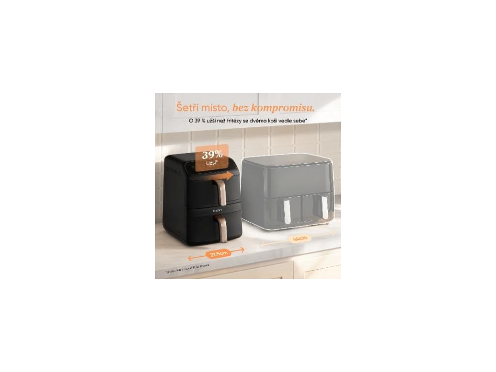 Vďaka svojmu vertikálnemu dizajnu zaberá Cosori Turbo Tower™ Compact o 39 % menej miesta ako tradičné fritézy s dvoma košíkmi. Aj pri šírke iba 27,5 cm ponúka plný objem 8,6 litra. Vďaka tomu máte na pracovnej doske viac miesta bez obmedzenia výkonu alebo objemu. Ideálne riešenie pre moderné a menšie kuchyne.