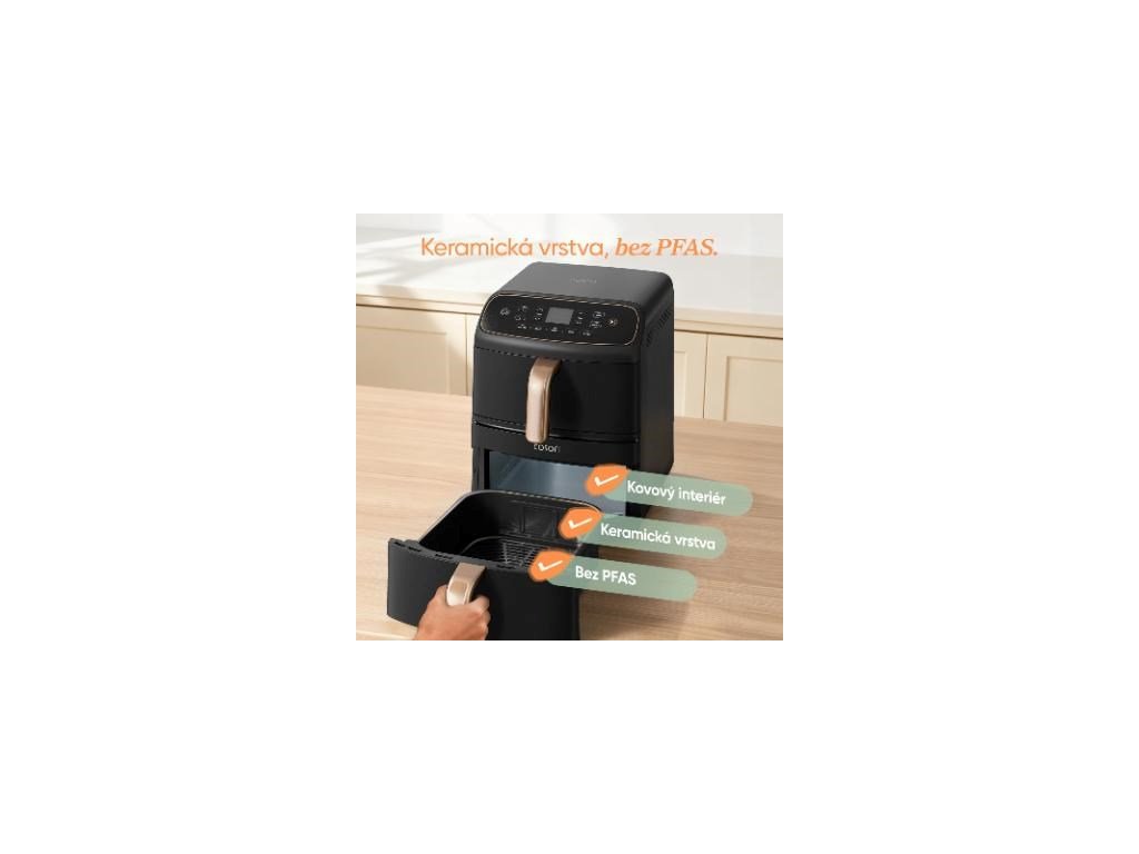 Koše a grilovacie platne sú potiahnuté prémiovým keramickým povlakom, ktorý ponúka vyššiu odolnosť proti opotrebeniu ako tradičné nepriľnavé povrchy. Zatiaľ čo teflón je veľmi krehký a časom sa môže poškriabať, keramika si zachováva svoje vlastnosti aj pri intenzívnom každodennom používaní. Povrch je extrémne hladký, takže jedlo sa nelepí a čistenie je otázkou sekúnd. Výsledkom je dlhotrvajúca, krásna fritéza, ktorá funguje rovnako dobre aj po stovkách varení.
