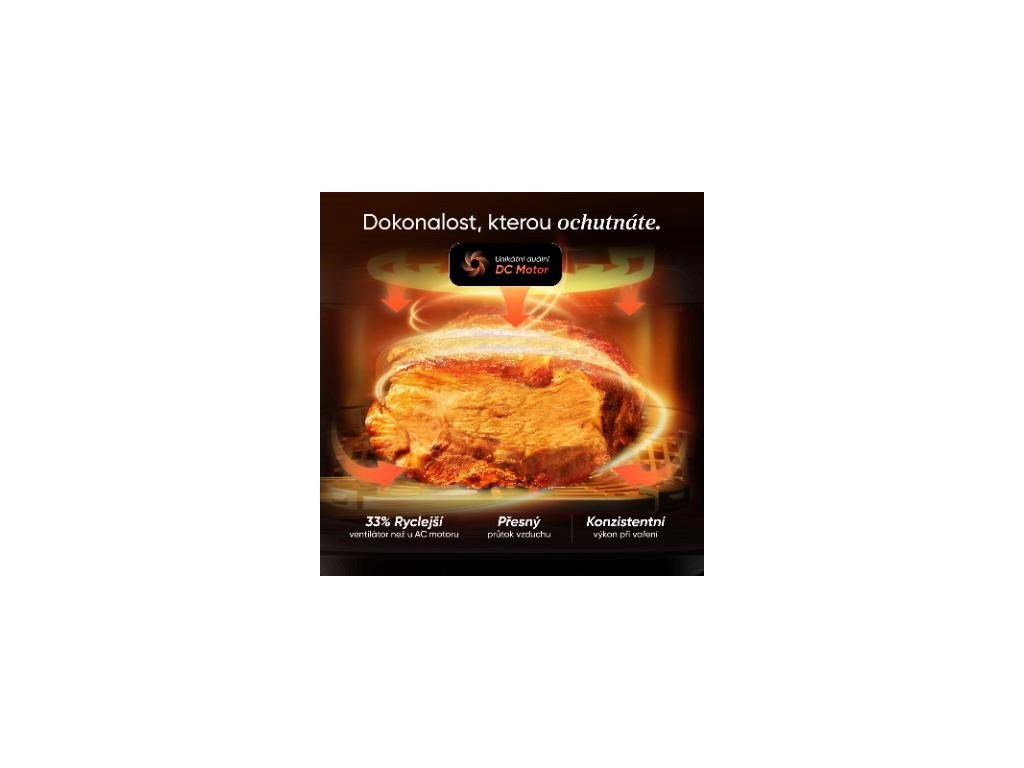 Vo vnútri zabezpečujú dva výkonné jednosmerné motory rýchlejšie zahrievanie a efektívnejší prietok vzduchu. To znamená kratšie časy varenia pri zachovaní nižšej spotreby energie. Potraviny sú hotové rýchlejšie, ale bez kompromisov v chuti alebo štruktúre. Skutočné výhodné riešenie.