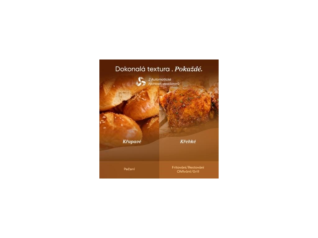 Inteligentné riadenie prúdu vzduchu automaticky prispôsobuje rýchlosť ventilátora podľa typu potravín. Výsledkom je vždy jemné mäso, chrumkavé pečivo a dokonale upečené hranolky. Systém Turbo Tower™ zabezpečuje, že potraviny nie sú ani prepečené, ani nedopečené. Dokonalá konzistencia bez dozoru.