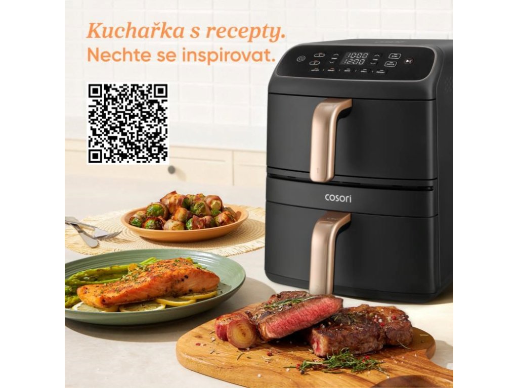 Balíček obsahuje originálnu kuchársku knihu s 20 receptami, ktoré boli špeciálne vyvinuté pre Cosori Turbo Tower™ Compact. Recepty dokonale využívajú dvojité koše, výkonné DC motory a funkcie SYNC & MATCH. Česká verzia je k dispozícii online, takže máte vždy po ruke jasné a zrozumiteľné pokyny. Od prvého dňa budete variť rýchlo, správne a bez experimentovania. Kniha receptov, ktorá je súčasťou balenia, je viacjazyčná (ENG, DE, FR, IT, ES) a českú verziu si môžete stiahnuť online.