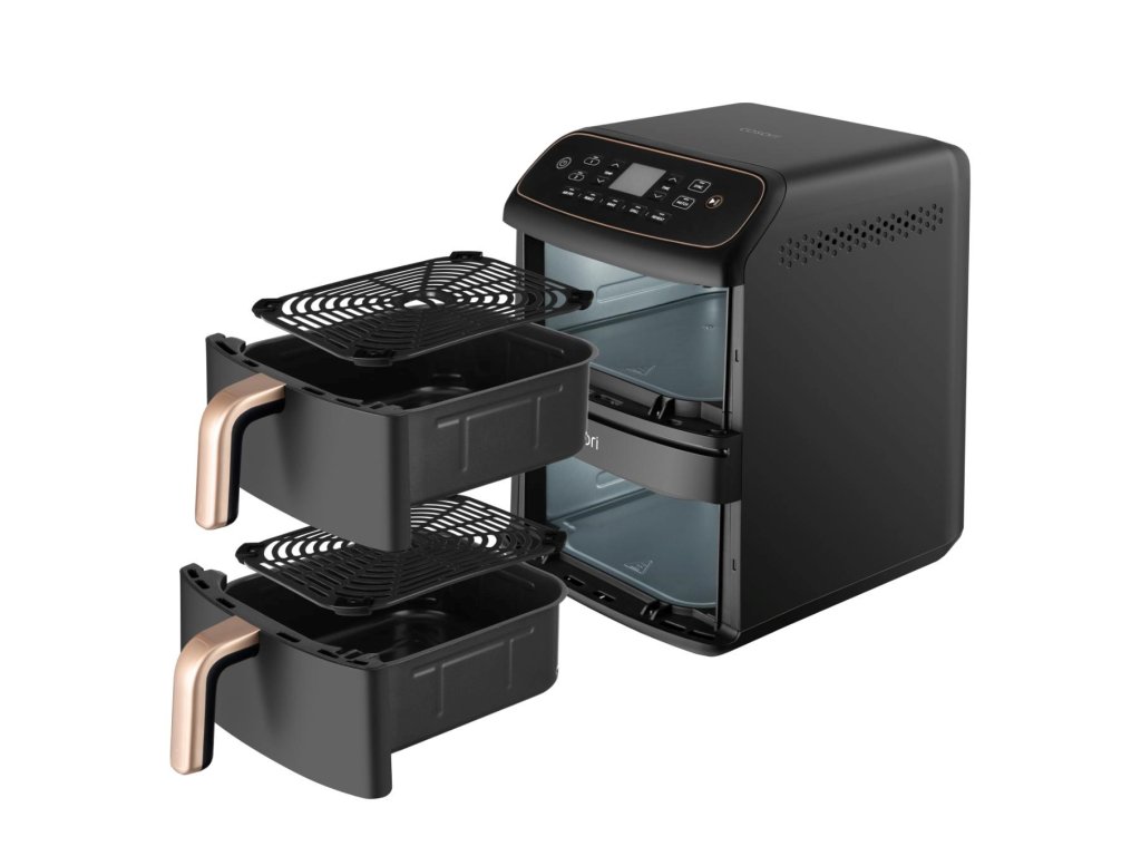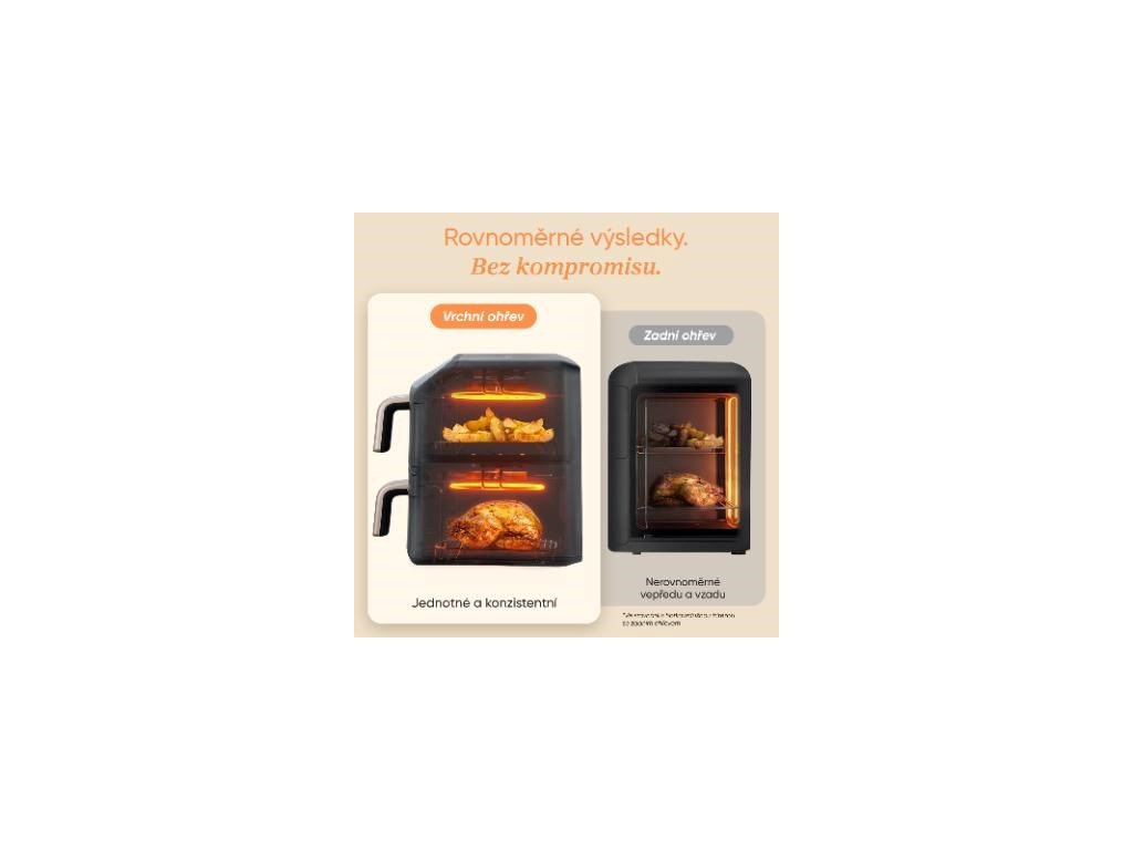 Kombinácia výkonného horného vykurovacieho telesa a rýchlych ventilátorov DC vytvára intenzívnu a rovnomernú cirkuláciu horúceho vzduchu. Teplo sa distribuuje do oboch košov, takže vaše jedlo je rovnomerne uvarené zo všetkých strán. Žiadne studené miesta, žiadne spálené okraje. Len konzistentné a dokonalé výsledky.