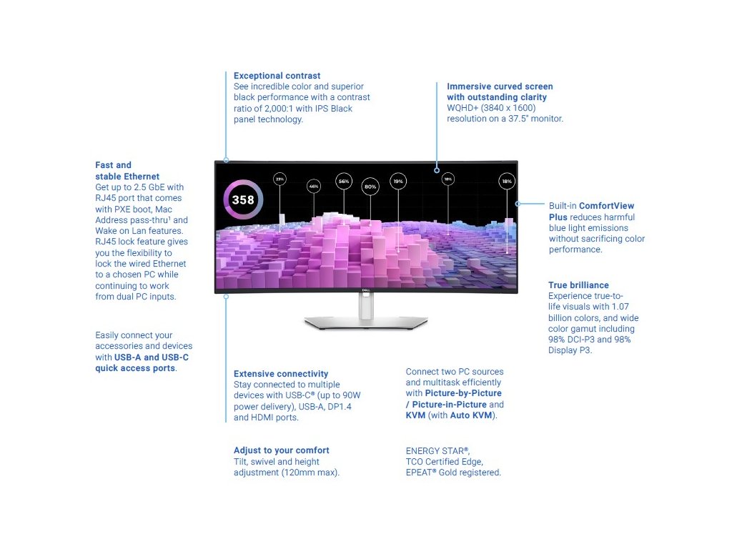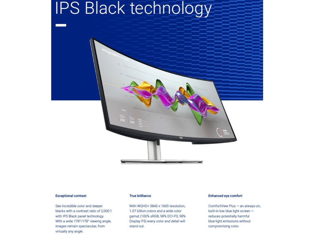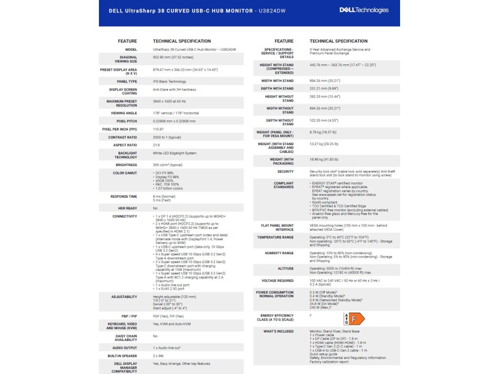 UltraSharp 38 Curved USB-C Hub Monitor – U3824DW TECHNICAL SPECIFICATION: DIAGONAL VIEWING SIZE: 952.90 mm (37.52 inches) PRESET DISPLAY AREA (H X V): 879.67 mm x 366.53 mm (34.63” x 14.43”) PANEL TYPE: IPS Black Technology DISPLAY SCREEN COATING: Anti-Glare with 3H hardness MAXIMUM PRESET RESOLUTION: 3840 x 1600 at 60 Hz VIEWING ANGLE: 178° vertical / 178° horizontal PIXEL PITCH: 0.22908 mm x 0.22908 mm PIXEL PER INCH (PPI): 110.87 CONTRAST RATIO: 2000 to 1 (typical) ASPECT RATIO: 21:9 BACKLIGHT TECHNOLOGY: White LED Edgelight System BRIGHTNESS: 300 cd/m2 (typical) TCO Certified: Yes COLOR GAMUT: • DCI-P3 98% • Display P3 98% • sRGB 100% • REC. 709 100% • 1.07 billion colors RESPONSE TIME: 8 ms (Normal), 5 ms (Fast) HDR READY: No CONNECTIVITY: • 1 x DP 1.4 (HDCP2.2) (supports up to WQHD+ 3840 x 1600 60 Hz) • 2 x HDMI port (HDCP2.2) (supports up to WQHD+ 3840 x 1600 60 Hz TMDS as per specified in HDMI 2.1) • 1 x USB Type-C upstream port (video and data) (Alternate mode with DisplayPort 1.4, Power Delivery up to 90W) • 1 x USB-C upstream port (data only, 10 Gbps USB 3.2 Gen2) • 4 x Super speed USB 10 Gbps (USB 3.2 Gen2) Type-A downstream port • 2 x Super speed USB 10 Gbps (USB 3.2 Gen2) Type-C downstream port with charging capability at 15W (maximum) • 1 x Super speed USB 10 Gbps (USB 3.2 Gen2) Type-A with BC1.2 charging capability at 2 A (maximum) • 1 x Audio line-out port • 1 x RJ45 2.5G port ADJUSTABILITY: Height adjustable (120 mm), Tilt (-5° to 21°), Swivel (-30° to 30°), Slant adjust (-4° to 4°) PBP/PIP: PbP (Yes), PiP (Yes) KEYBOARD, VIDEO AND MOUSE (KVM): Yes, KVM and Auto-KVM DAISY CHAIN AVAILABILITY: No AUDIO OUTPUT: 1 x Audio line-out BUILT-IN SPEAKER: 2 x 9W DELL DISPLAY MANAGER: Yes, Easy Arrange, Other key features SPECIFICATIONS - SERVICE / SUPPORT DETAILS: 3-Year Advanced Exchange Service and Premium Panel Exchange HEIGHT WITH STAND (COMPRESSED ~ EXTENDED): 443.76 mm ~ 563.76 mm (17.47” ~ 22.20”) WIDTH WITH STAND: 894.26 mm (35.21”) DEPTH WITH STAND: 251.21 mm (9.89”) HEIGHT WITHOUT STAND: 392.33 mm (15.44”) WIDTH WITHOUT STAND: 894.26 mm (35.21”) DEPTH WITHOUT STAND: 102.35 mm (4.03”) WEIGHT (PANEL ONLY - FOR VESA MOUNT): 8.79 kg (19.37 lb) WEIGHT (WITH STAND ASSEMBLY AND CABLES): 13.27 kg (29.25 lb) WEIGHT (WITH PACKAGING): 18.98 kg (41.83 lb) SECURITY: Security lock slot2 (cable lock sold separately) Anti-theft stand lock slot (to lock stand to monitor using screw) COMPLIANT STANDARDS: ENERGY STAR® certified monitor EPEAT® registered where applicable. EPEAT registration varies by country RoHS-compliant TCO Certified & TCO Certified Edge BFR/PVC free monitor (excluding external cables) Arsenic-free glass and Mercury-free for the panel only FLAT PANEL MOUNT INTERFACEVESA mounting holes (100 mm x 100 mm - behind attached VESA Cover) FWHAT’S INCLUDED: Monitor, Stand Riser, Stand Base 1x Power cable1 x DP Cable (DP to DP) - 1.8 m 1x HDMI cable (HDMI-HDMI) - 1.8 m 1x Type-C Gen 2 (C-C cable) - 1 m 1x USB-A to USB-C Gen 2 cable - 1 m Quick setup guide Safety, Environmental and Regulatory Information Factory calibration report Odkaz na stránky výrobce: https://www.dell.com/en-us/shop/dell-ultrasharp-38-curved-usb-c-hub-monitor-u3824dw/apd/210-bhsm/monitors-monitor-accessoriesDodatočné parametre