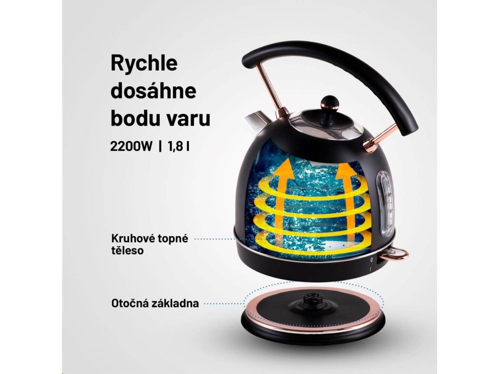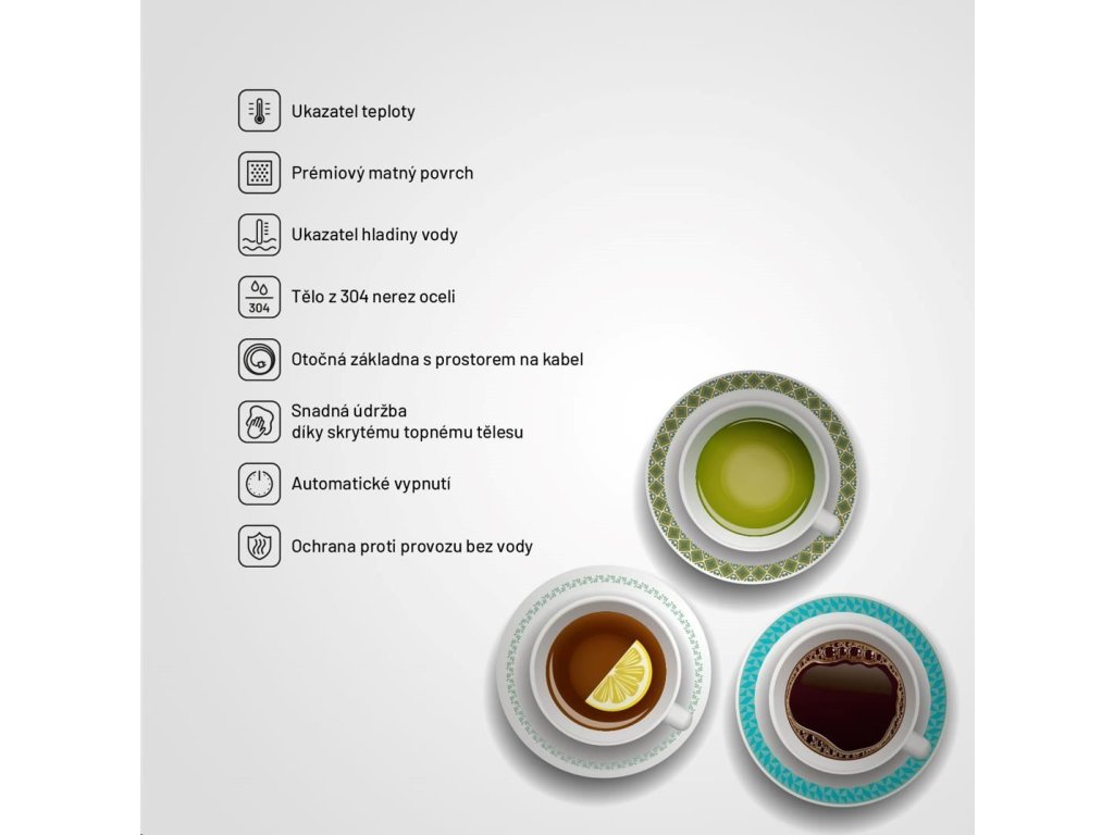 - Bezpečnostné funkcie: Automatické vypnutie po dosiahnutí varu, ochrana proti chodu nasucho, poistka proti prehriatiu