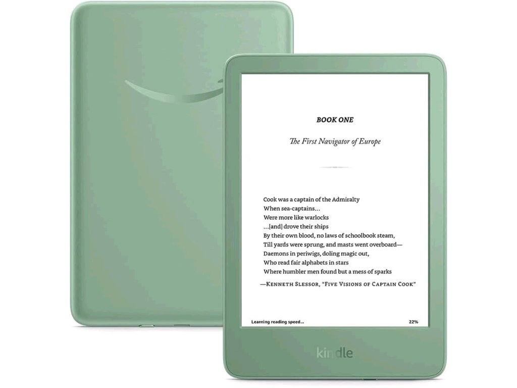 Nejlehčí a nejkompaktnější Kindle – nyní s jasnějším předním světlem při maximálním nastavení, vyšším kontrastním poměrem a rychlejším otáčením stránek pro lepší zážitek ze čtení. Čtení bez námahy za jakéhokoli světla – Čtěte pohodlně pomocí 6“ neoslňujícího displeje, nastavitelného předního světla – nyní o 25 % jasnějšího při maximálním nastavení – a tmavého režimu. Utečte do svých knih – Vylaďte si zprávy, e-maily a sociální média s ničím nerušeným čtením. Chvíli čtěte – Získejte až 6 týdnů výdrže baterie na jedno nabití. Vezměte si knihovnu s sebou – 16 GB úložiště pojme tisíce knih. Najděte nové příběhy – Předplatné Kindle Unlimited odemkne přístup k více než 4 milionům titulů, tisícům audioknih a dalším. Navrženo s ohledem na udržitelnost – Tento Kindle používá 75 % recyklovaných plastů a 90 % recyklovaného hořčíku a má 100 % recyklovatelné obaly zařízení. - Display 6” displej Amazon s vestavěným světlem, 300 ppi, optimalizovaná technologie písma, 16-úrovňová stupnice šedé. - Velikost 157,8 x 108,6 x 8,0 mm - Hmotnost 158 g - Úložiště 16 GB - Životnost baterie Na jedno nabití vydrží až šest týdnů na základě půl hodiny čtení denně s vypnutým bezdrátovým připojením a nastavením světla na 13. Výdrž baterie se může lišit v závislosti na používání. - Doba nabíjení Plně se nabije přibližně za 4 hodiny z počítače přes USB kabel, Plně se nabije za přibližně 2 hodiny s 9W USB napájecím adaptérem. - Wi-Fi připojení Podporuje sítě 2,4 GHz a 5,0 GHz s podporou zabezpečení WEP, WPA, WPA2, WPA3 a OWE pomocí ověřování heslem nebo Wi-Fi Protected Setup (WPS). Nepodporuje připojení k ad-hoc (nebo peer-to-peer) wifi sítím. - Podporované formáty obsahu Kindle Format 8 (AZW3), Kindle (AZW), TXT, PDF, nechráněné MOBI, PRC nativně, PDF, DOCX, DOC, HTML, EPUB, TXT, RTF, JPEG, GIF, PNG, BMP prostřednictvím převodu. - Obsah balení Kindle, nabíjecí kabel USB-C a průvodce rychlým startem.Dodatočné parametre
