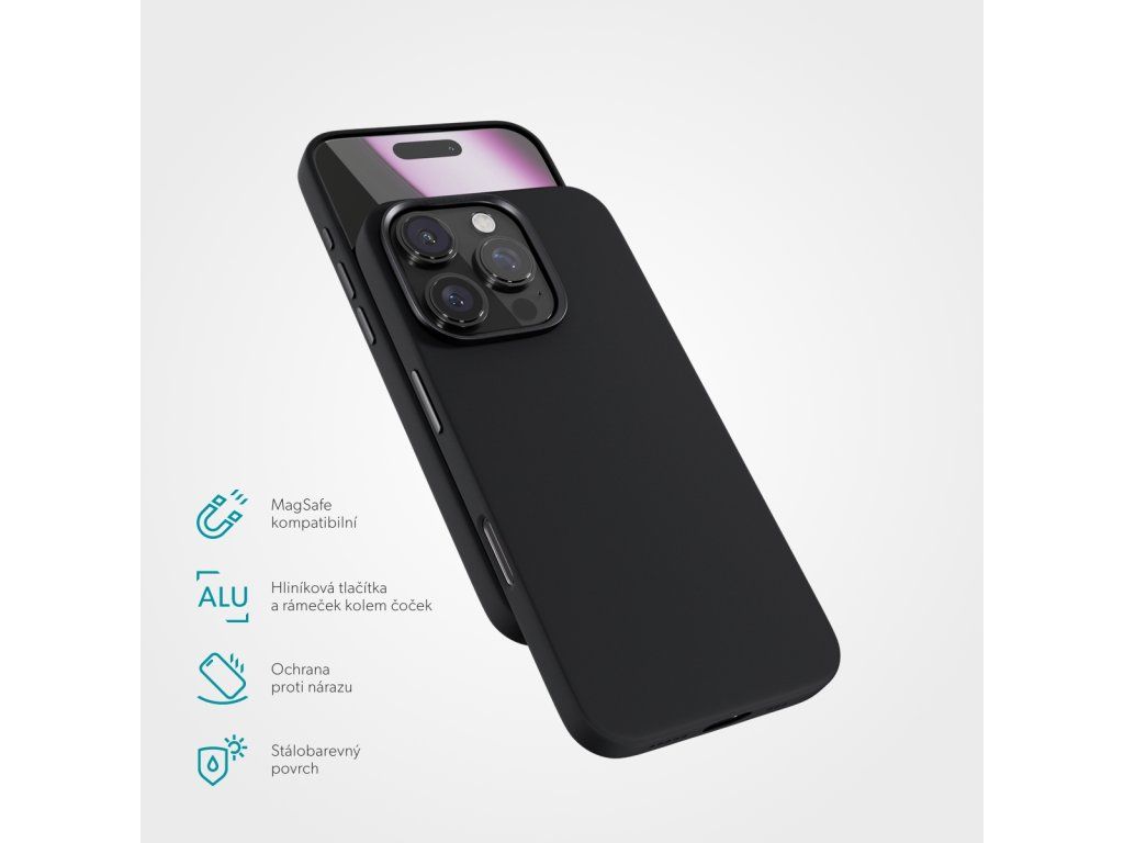 Kryt na telefon, pro Apple iPhone 16 Pro Max, kompatibilní s MagSafe, materiál silikon, hliníková tlačítka, hliníkový rámeček kolem objektivů. Stylová silikonová ochrana s hliníkovými detaily MagSafe kompatibilní: Kompatibilita s MagSafe zaručuje bezdrátové nabíjení bez přerušení. SGS pádový test 1,2m: Kryt byl testován a prokazatelně chrání telefon před pády z výšky až 1,2 m. Vyvýšený rámeček kolem čoček: Poskytuje plné krytí zranitelných míst iPhonu. Hliníkové detaily: Elegantní hliníková tlačítka a rámeček kolem čoček poskytují extra ochranu. Stálobarevnost a ochrana proti otiskům prstů: Dlouhodobě zachovává původní barvu a odolává otiskům prstů. Podšívka z mikrovlákna: Měkká podšívka z mikrovlákna poskytuje dodatečný komfort. Snadné nasazení: Díky pružnému rámečku se snadno nasazuje a sundává.Dodatočné parametre