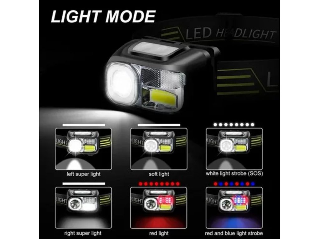 COB LED - 100% plný výkon, zmena na červený mód svietenia alebo blikanie červeno-modrého COB LED ako zadné blikacie svetlo cyklistov. Tým pádom je toto čeľové svietidlo vhodné pre univerzálne použitie.