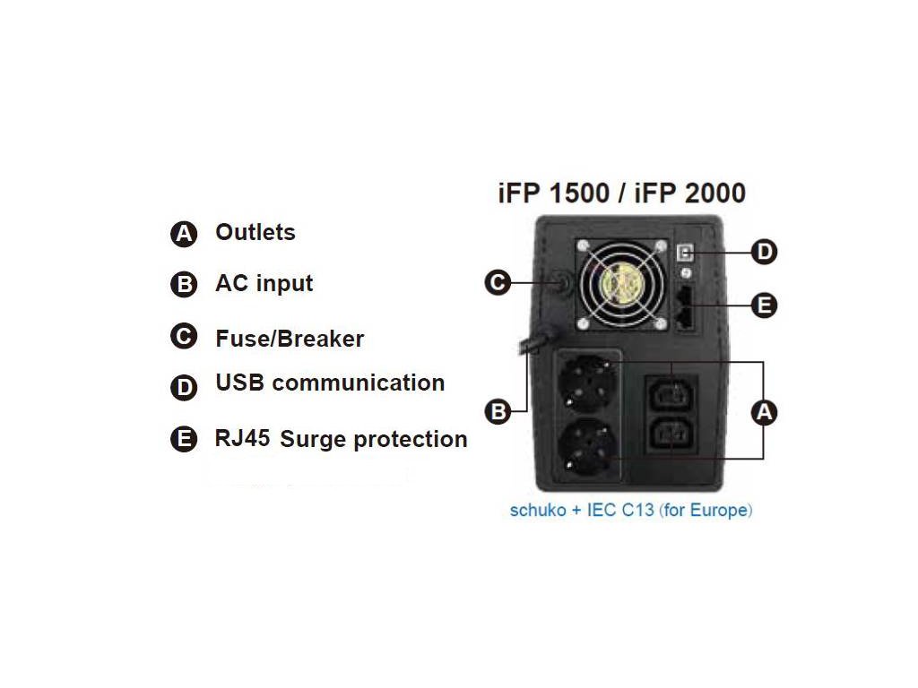 UPS zdroj slouží jako záložní baterie, která udrží počítače, servery a jinou IT techniku v chodu při výpadku elektrického proudu. Hlavní vlastnosti: *Dotykový display LCD *USB komunikační port *Ochrana RJ45 *Řada iFP je vybavena automatickou regulací napětí a tím snižuje dopad nestabilního napětí na zařízení. *Kompaktní velikost *Vynikající mikroprocesorové řízení zaručuje vysokou spolehlivost *Stabilizace napětí *Automatické zapnutí při obnově dodávky elektrické energie *automaticky se nabíjí po obnovení napájení *Dobíjení i ve vypnutém režimu *Funkce studeného startu (bez připojení do elektrické sítě) VÝSTUP Kapacita výstupního výkonu [W]: 900 Kapacita výstupního výkonu [VA]: 1500 Výstupní napětí [V]: 220 Topologie: Line-interactive Typ křivky: Simulovaná sinusoida Výstupní přípojky: 2x Schuko, 2x IEC C13 VSTUP Vstupní napětí [V]: 220 / 230 / 240 Kmitočet na vstupu [Hz]: 50/60 Rozsah vstupního napětí [VAC]: 140 - 290 BATERIE A DOBA BĚHU Typ baterie: 12V / 9Ah Předinstalované baterie: 2 Obvyklá doba nabíjení [Hod]: 4 - 6 KOMUNIKACE A SPRÁVA Port rozhraní: USB Indikátory: LCD displej Zvukové upozornění: Ano FYZICKÉ Maximální výška [cm]: 18 Maximální šířka [cm]: 13 Maximální hloubka [cm]: 32 Čistá hmotnost [kg]: 10,4 Barva: Černá Provozní teplota [°C]: 0 - 40 Hlučnost [dB]: méně než 40 Obsah balení: Jednotka UPS včetně instalované baterie, Uživatelská příručka UPS selector: https://energy.fsp-europe.com/ -> Tools -> UPS Selector Odkaz na stránky výrobce: https://energy.fsp-europe.com/product/ifp-1500-2/ Video k Software ViewPower: https://www.youtube.com/watch?v=r3P4zmNBzjc Odkaz pro stažení softwaru ViewPower: https://www.power-software-download.com/viewpower.htmlDodatočné parametre