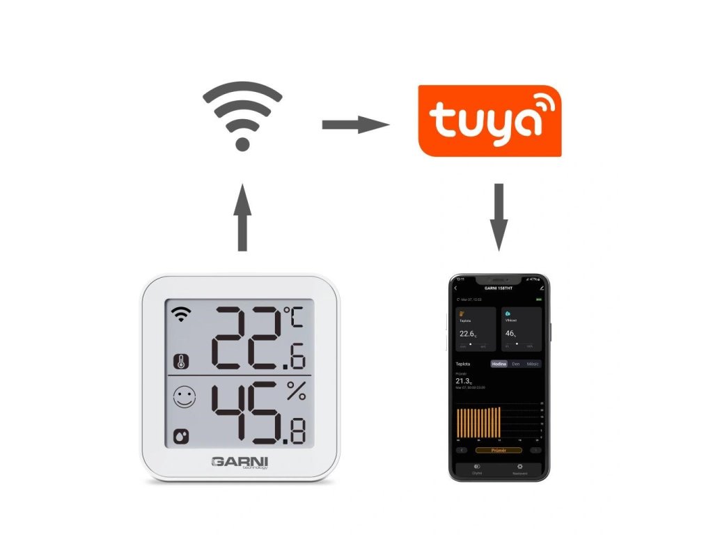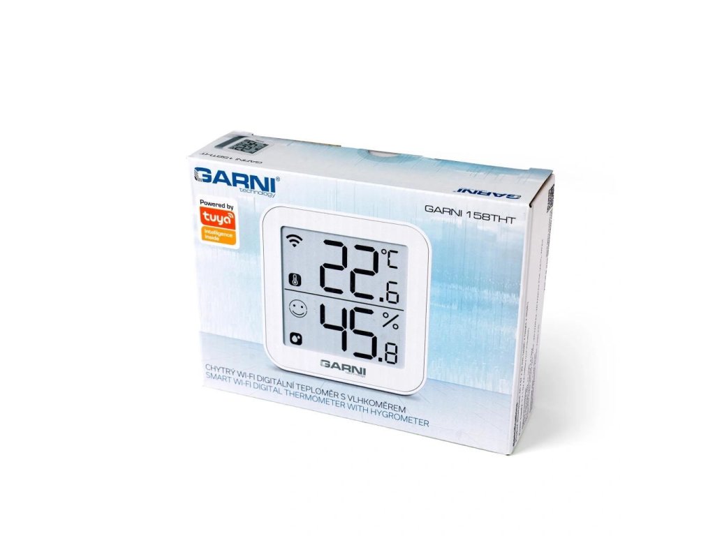 Chytrý vnútorný digitálny teplomer s vlhkomerom model GARNI 158THT má zabudovaný Wi-Fi modula prostredníctvom svojho chytrého systému je kompatibilný s platformou Tuya IOT. Pomocou aplikácie Tuya Smart môžete sledovať vnútornú teplotu a relatívnu vlhkosť, prehliadať históriu záznamov, nastavovať alarmy pre dané veličiny, spúšťať pokročilé funkcie za pomoci nameraných hodnôt a odoslať namerané údaje na email v Excel súbore. Je možné ho prepojiť s ďalšími produktmi chytré domácnosti, ovládanie potom prebieha cez aplikáciu v mobilnom zariadení. Podporuje integráciu do Google Assistant a Alexa.