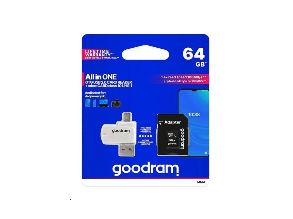 GOODRAM M1A4 All in One poskytuje všestrannosť tým, že poskytuje funkčnosť viacerých zariadení v jednom riešení. Ide o čítačku kariet vybavenú konektormi USB 2.0 a micro USB, umožňujúcu jednoduchý prenos dát medzi počítačmi, smartphonmi, tablety a fotoaparátmi. Dodáva sa s rýchlou UHS-I microSD kartou.