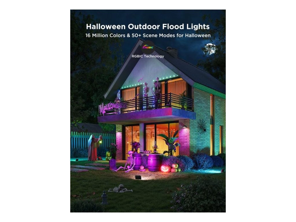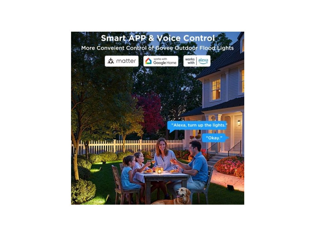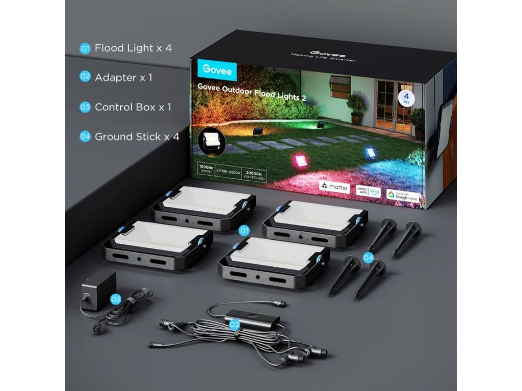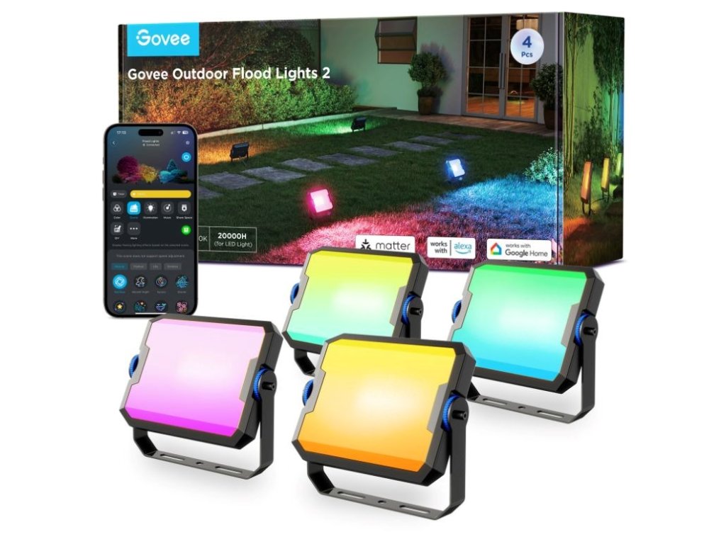 Vonkajšie energeticky úsporné LED reflektory Smart Flood Lights 2 urobia z vašej záhrady dizajnový skvost. Vďaka technológii RGBICWW dokážu svietiť svetlom s intenzitou až 1 000 lm a zobraziť až 16 miliónov farieb. Na výber máte určite viac ako 50 režimov osvetlenia a pri počúvaní obľúbenej hudby si môžete vybrať aj zo 6 režimov rytmu. Alebo si jednoducho nastavte vlastné farebné kombinácie podľa svojich predstáv na každom zo 4 svetiel LED. Príkazy môžete zadávať aj hlasom prostredníctvom Siri, Amazon Alexa alebo Google Assistant alebo prostredníctvom aplikácie Govee Home v smartfóne alebo tablete. Nové svetlá podporujú Matter, takže natívne podporujú aj Apple Homekit. Svetlo má celkovú dĺžku takmer 16 metrov a veľmi ľahko sa inštaluje. Pomocou časovača môžete svetlá automaticky zapínať a vypínať na základe západu a východu slnka. Svetlá majú stupeň vodotesnosti IP66 (okrem napájacieho adaptéra) s prevádzkovou teplotou od -20 °C do 40 °C.